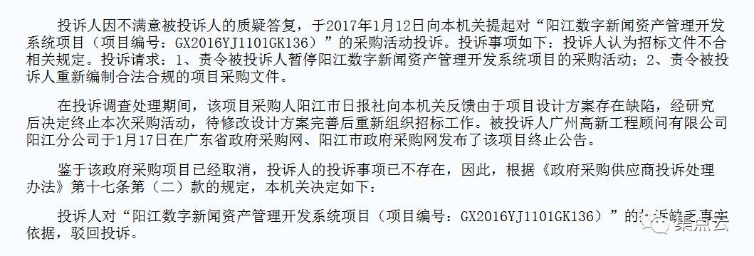 投诉人对“阳江数字新闻资产管理开发系统项目(项目编号:GX2016YJ1101GK136)”的投诉缺乏事实依据,驳回投诉。