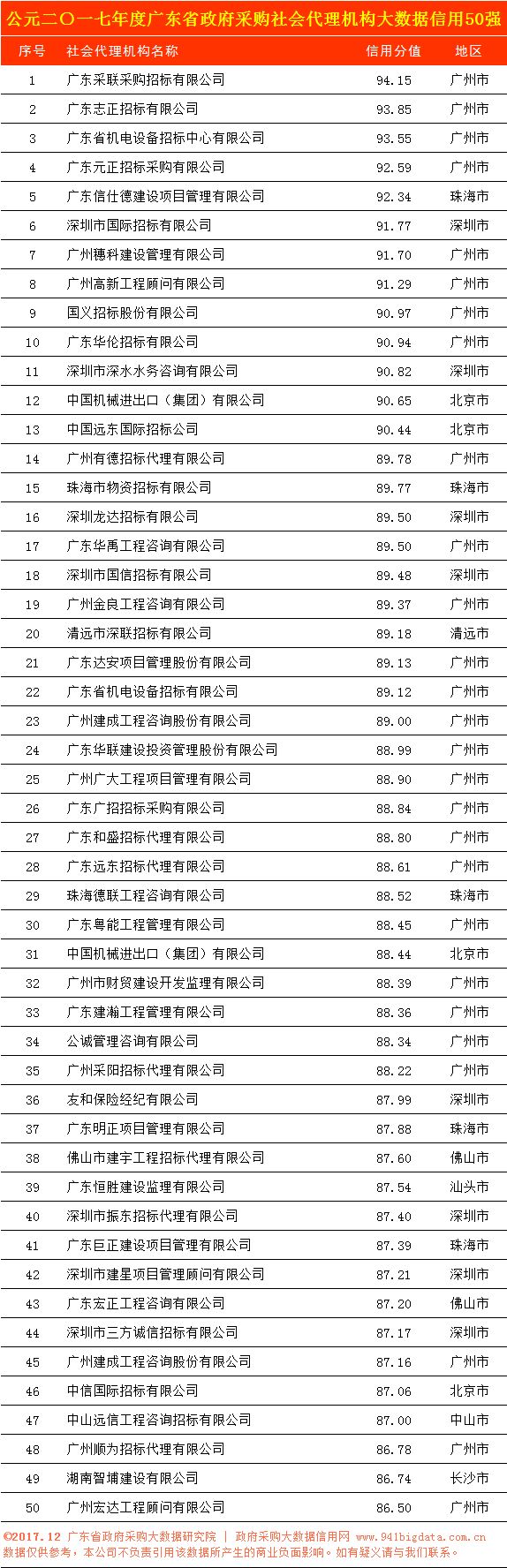 第二部分 广东省政府采购社会代理机构政府采购大数据信用50强公示名单