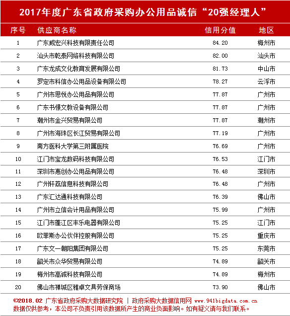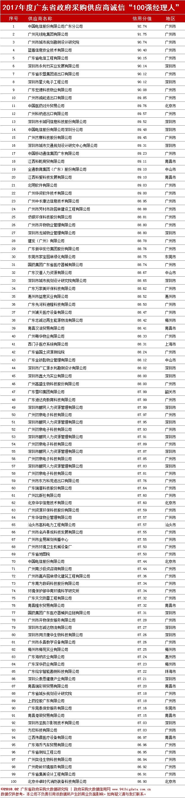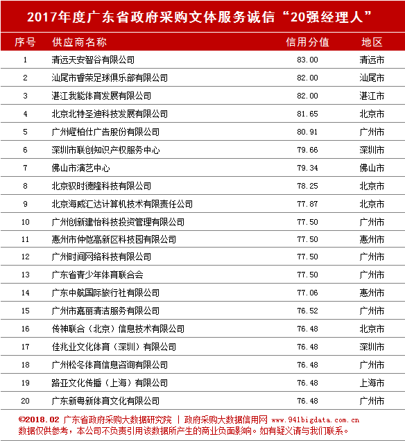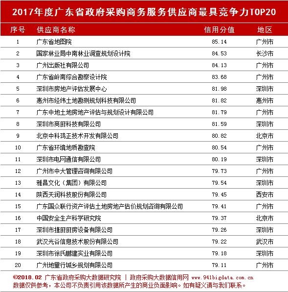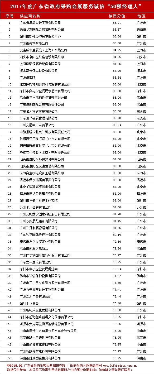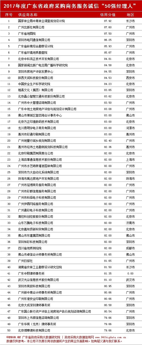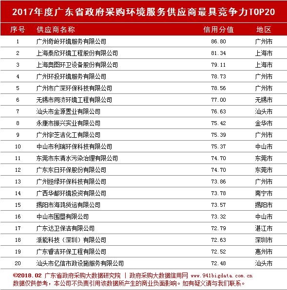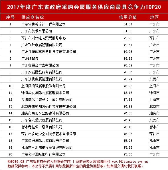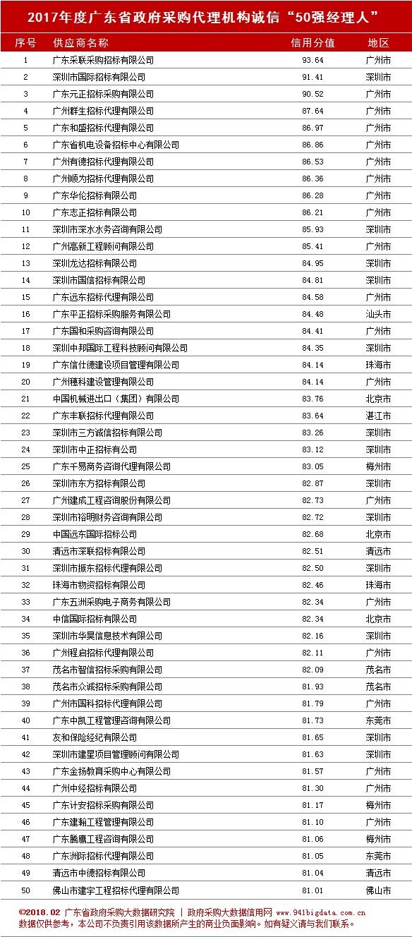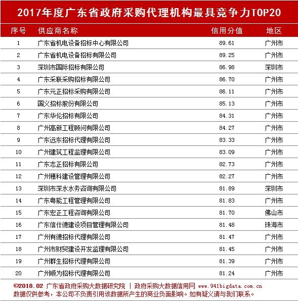 本次参评的政府采购供应商总数量达84418家,有效样本总数量84418家,代理机构总数达585家,有效样本数585家。数据来源于广东省内公开的各级政府采购相关信息,具体来源涵盖:广东省政府采购网的公开项目信息、政府各部门公布的采购信息、广东省政府采购各代理机构网站中公布的政府采购项目信息、中国政府采购网等。经广东省政府采购大数据研究院、政府采购大数据网综合评估,现正式对社会发布广东省政府采购代理机构诚信20强企业家榜单、代理机构诚信20强经理人榜单、代理机构竞争力20强榜单&供应商诚信100企业家榜单、供应商诚信100经理人榜单、供应商竞争力20强榜单。评估具体时段为:2017年1月1日至2017年12月31日。榜单公示期7天:2018年2月1日~7日。