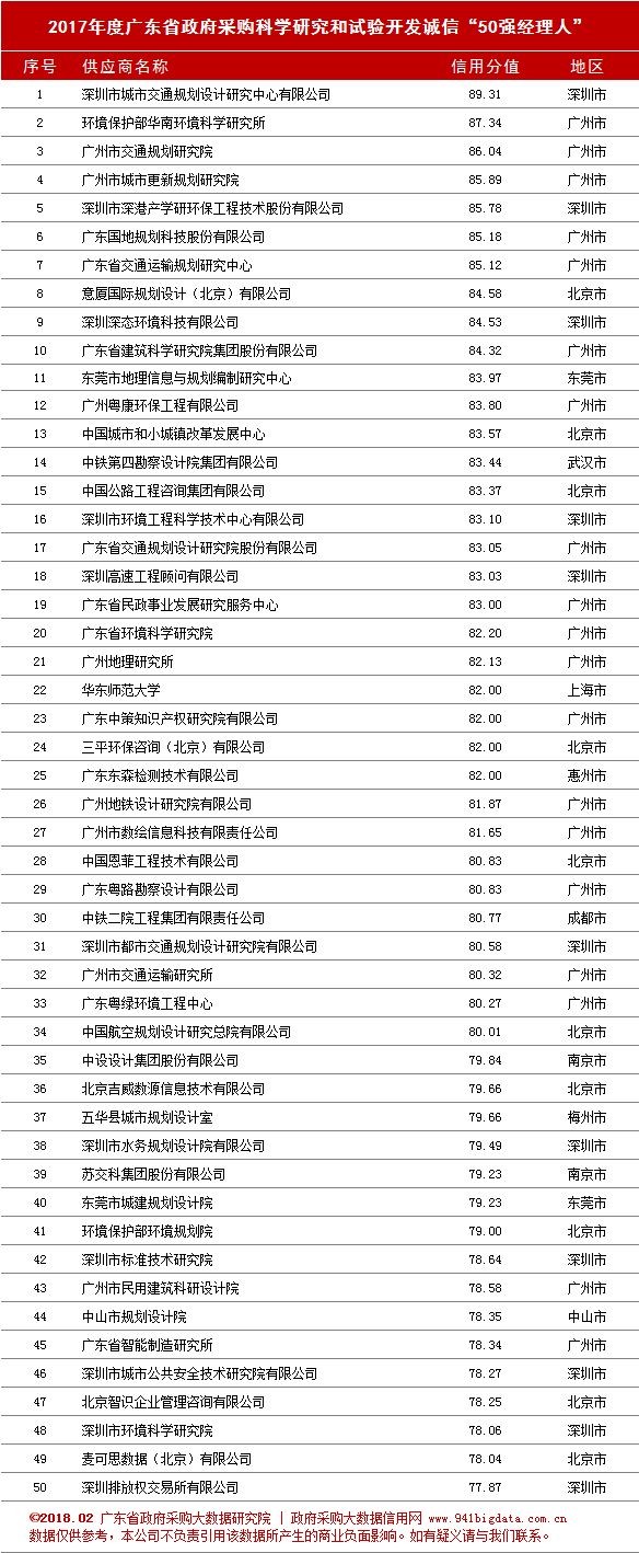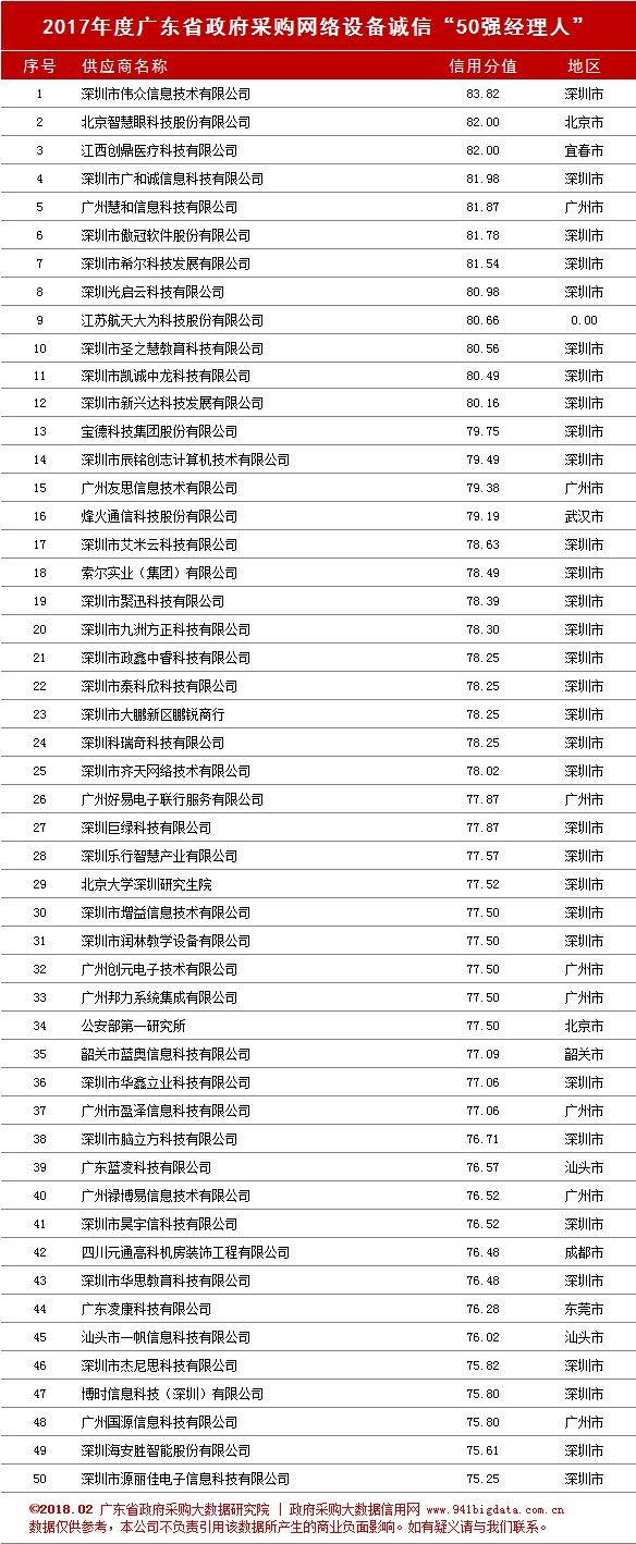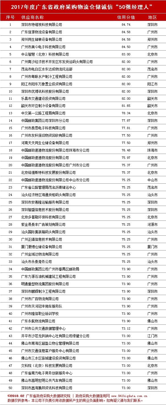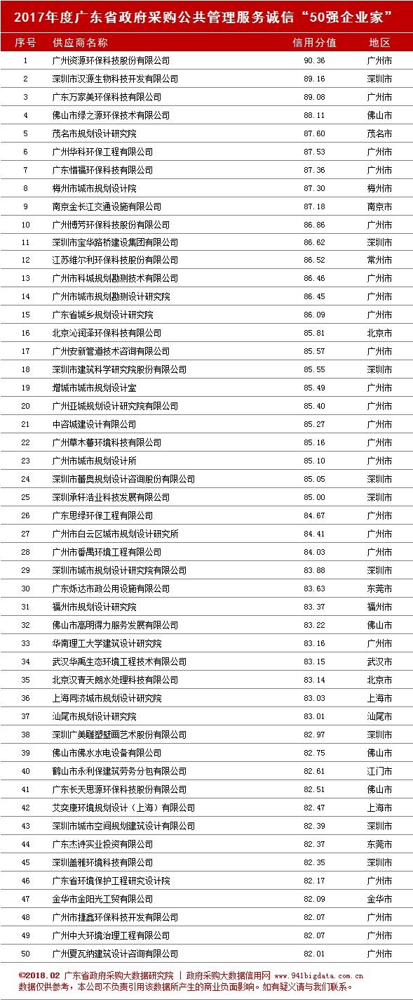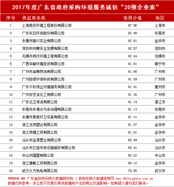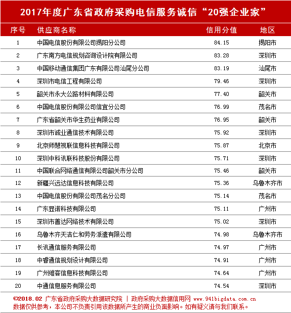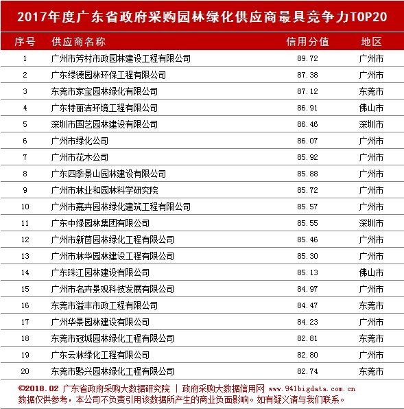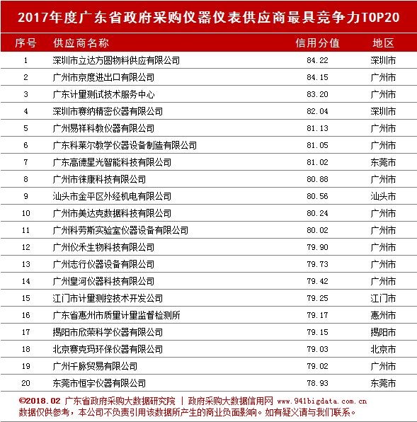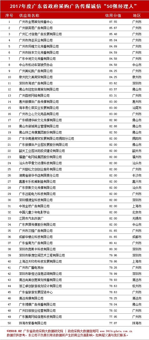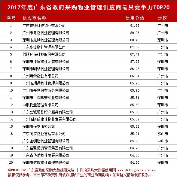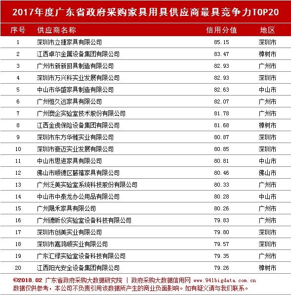 本次参评的政府采购供应商总数量达84418家,有效样本总数量84418家,代理机构总数达585家,有效样本数585家。数据来源于广东省内公开的各级政府采购相关信息,具体来源涵盖:广东省政府采购网的公开项目信息、政府各部门公布的采购信息、广东省政府采购各代理机构网站中公布的政府采购项目信息、中国政府采购网等。经广东省政府采购大数据研究院、政府采购大数据网综合评估,现正式对社会发布广东省政府采购代理机构诚信20强企业家榜单、代理机构诚信20强经理人榜单、代理机构竞争力20强榜单&供应商诚信100企业家榜单、供应商诚信100经理人榜单、供应商竞争力20强榜单。评估具体时段为:2017年1月1日至2017年12月31日。榜单公示期7天:2018年2月1日~7日。