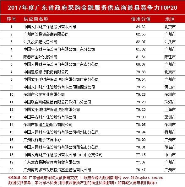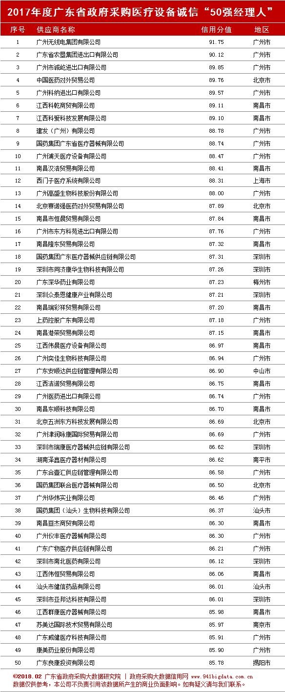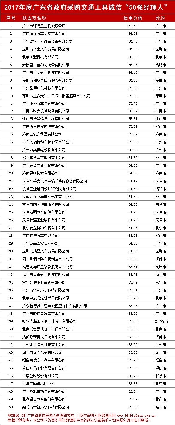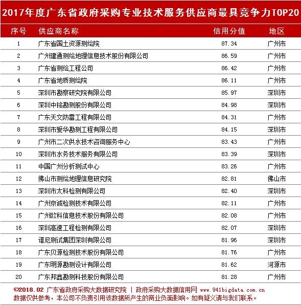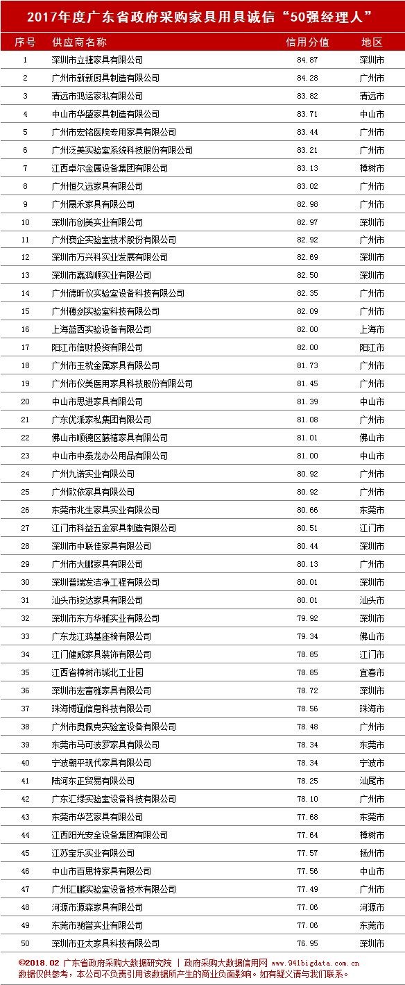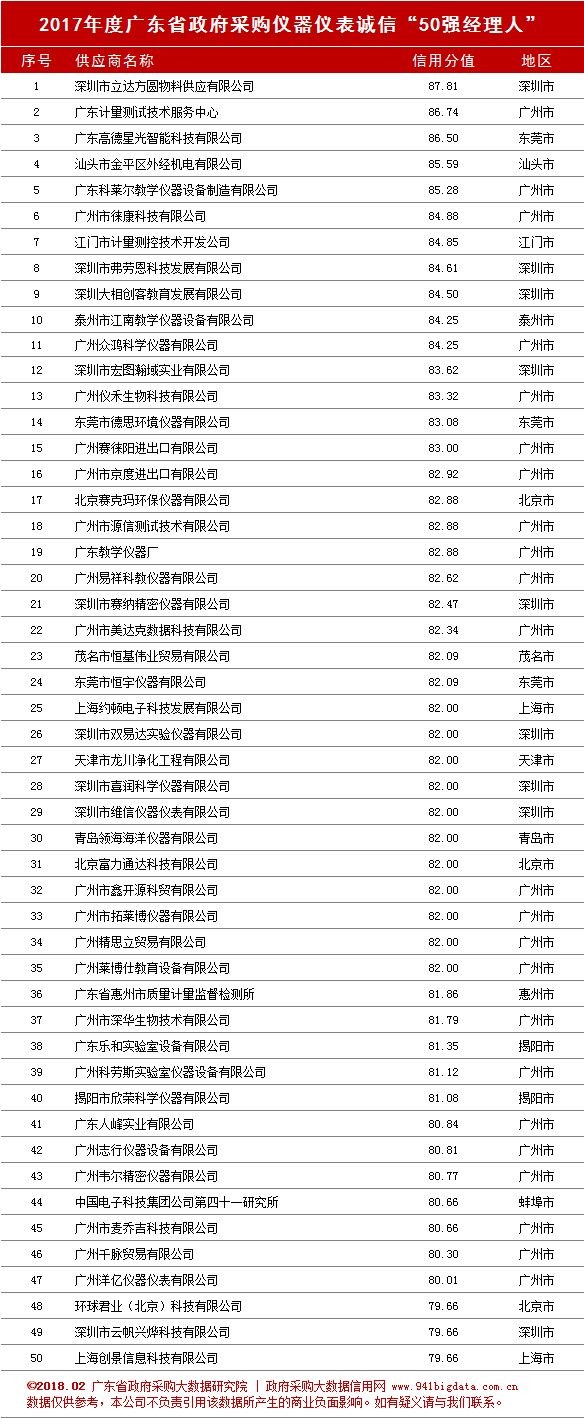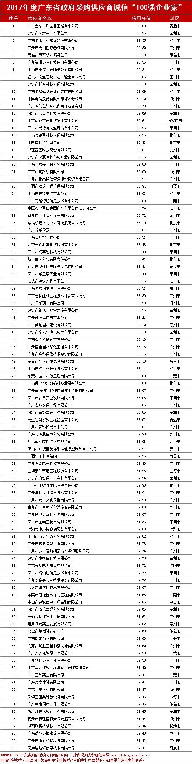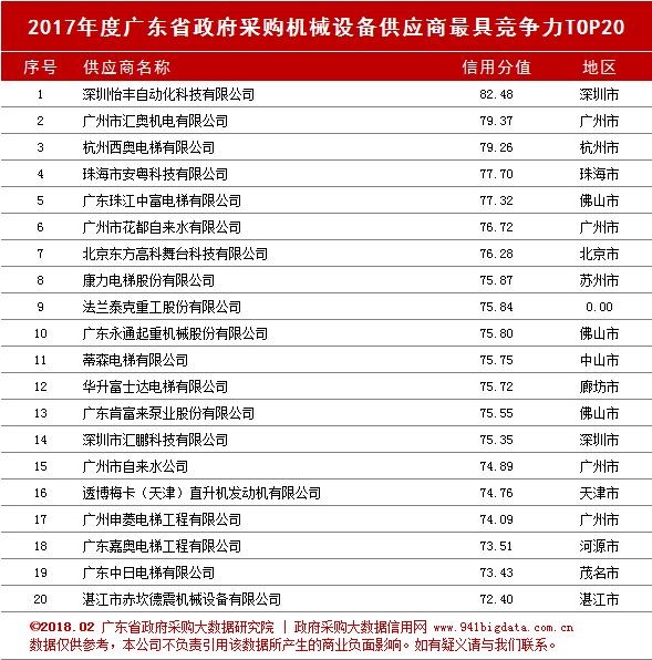 本次参评的政府采购供应商总数量达84418家,有效样本总数量84418家,代理机构总数达585家,有效样本数585家。数据来源于广东省内公开的各级政府采购相关信息,具体来源涵盖:广东省政府采购网的公开项目信息、政府各部门公布的采购信息、广东省政府采购各代理机构网站中公布的政府采购项目信息、中国政府采购网等。经广东省政府采购大数据研究院、政府采购大数据网综合评估,现正式对社会发布广东省政府采购代理机构诚信20强企业家榜单、代理机构诚信20强经理人榜单、代理机构竞争力20强榜单&供应商诚信100企业家榜单、供应商诚信100经理人榜单、供应商竞争力20强榜单。评估具体时段为:2017年1月1日至2017年12月31日。榜单公示期7天:2018年2月1日~7日。