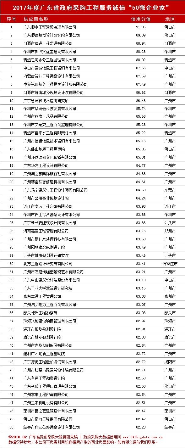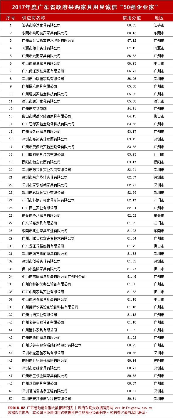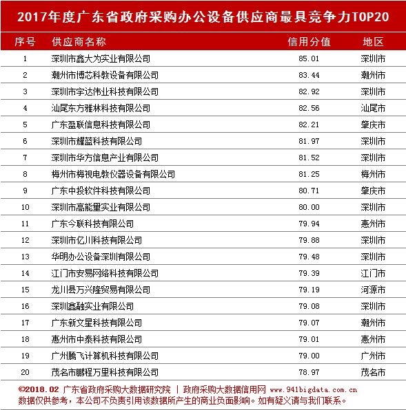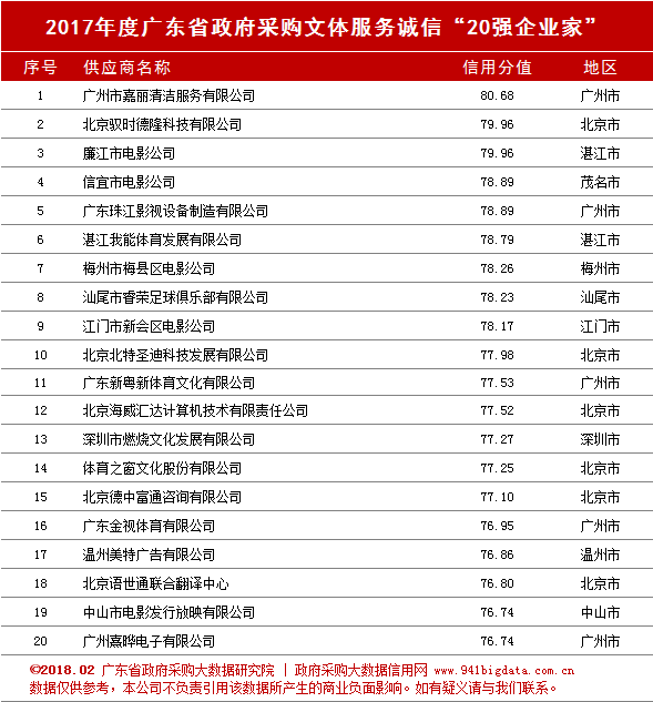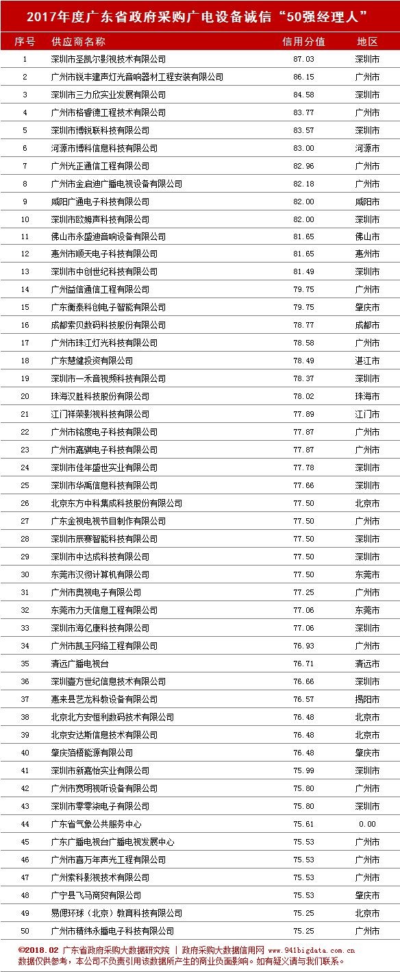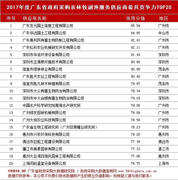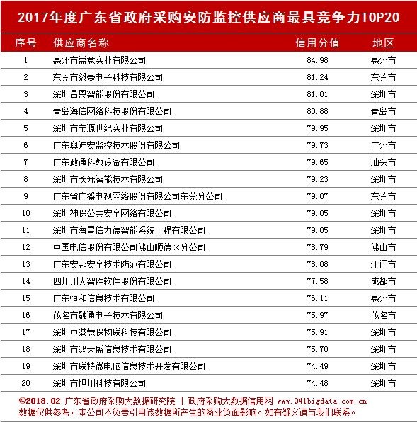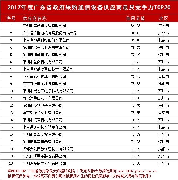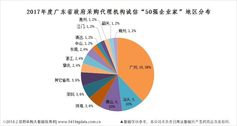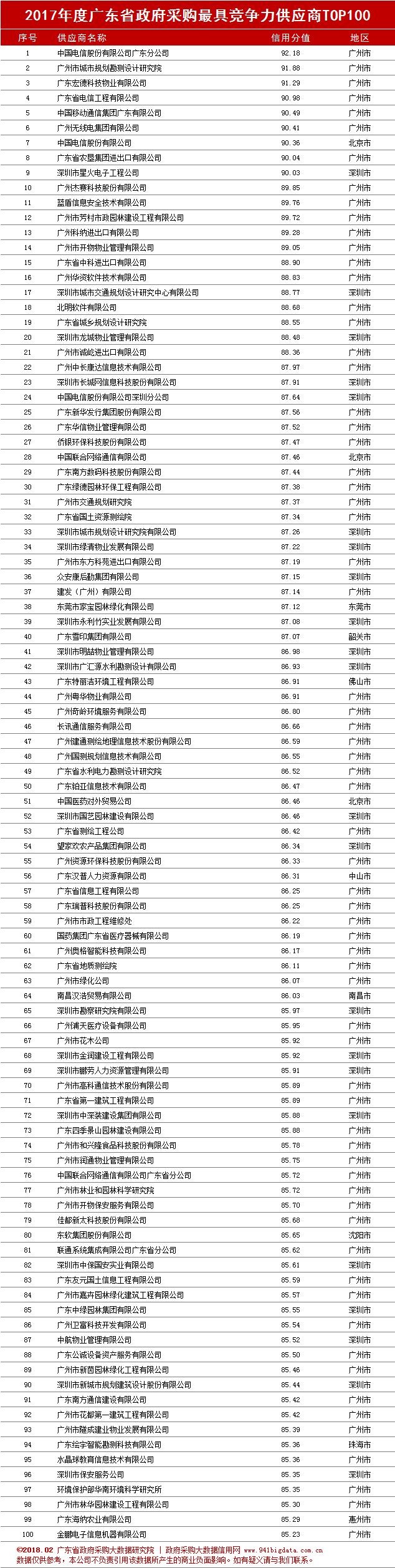 本次参评的政府采购供应商总数量达84418家,有效样本总数量84418家,代理机构总数达585家,有效样本数585家。数据来源于广东省内公开的各级政府采购相关信息,具体来源涵盖:广东省政府采购网的公开项目信息、政府各部门公布的采购信息、广东省政府采购各代理机构网站中公布的政府采购项目信息、中国政府采购网等。经广东省政府采购大数据研究院、政府采购大数据网综合评估,现正式对社会发布广东省政府采购代理机构诚信20强企业家榜单、代理机构诚信20强经理人榜单、代理机构竞争力20强榜单&供应商诚信100企业家榜单、供应商诚信100经理人榜单、供应商竞争力20强榜单。评估具体时段为:2017年1月1日至2017年12月31日。榜单公示期7天:2018年2月1日~7日。