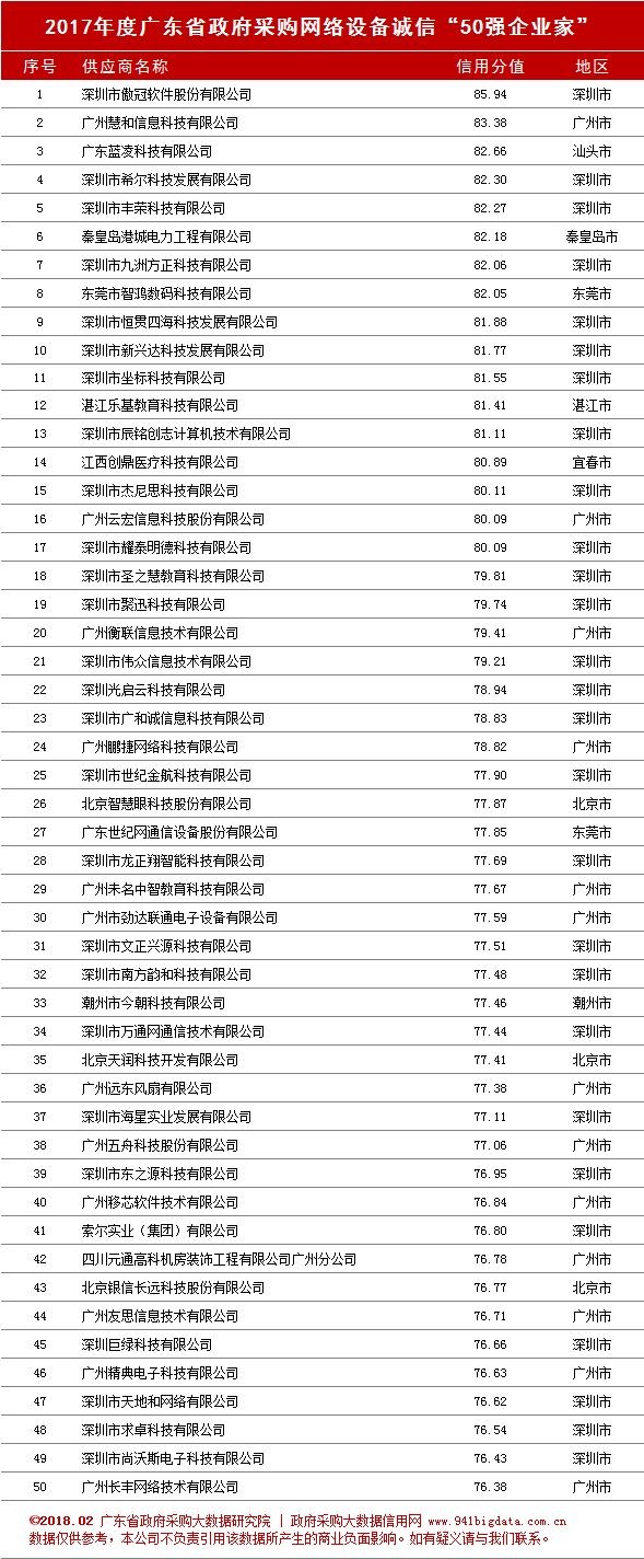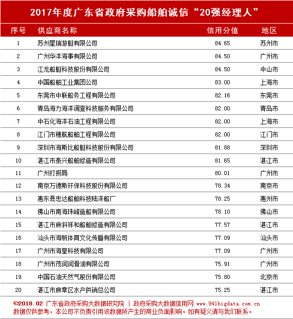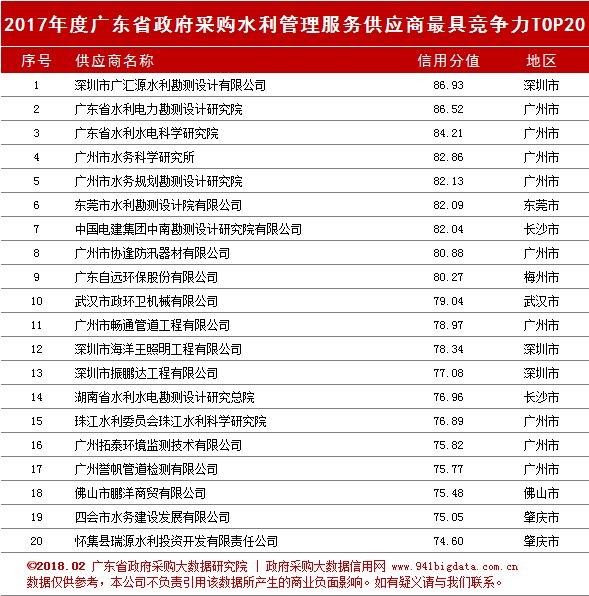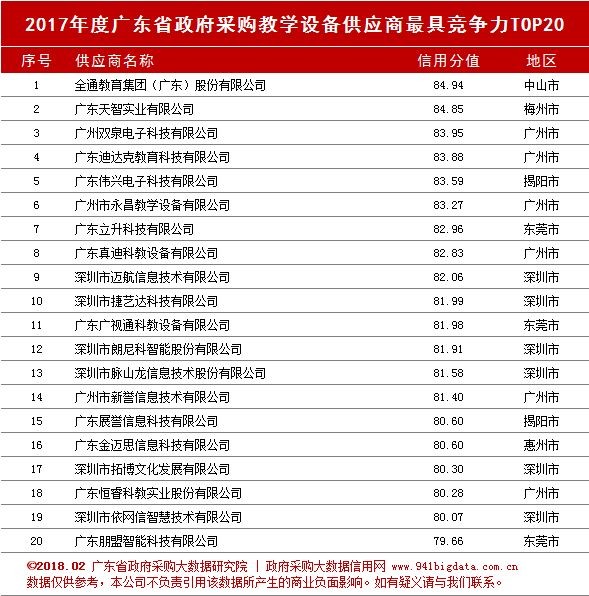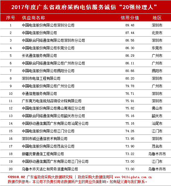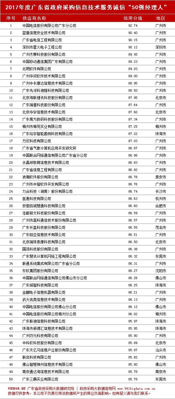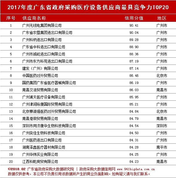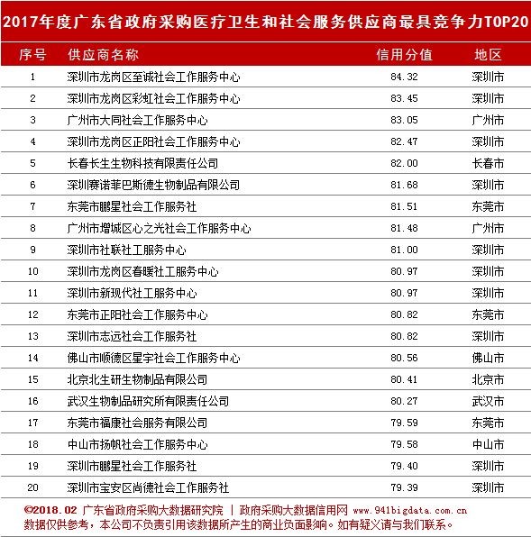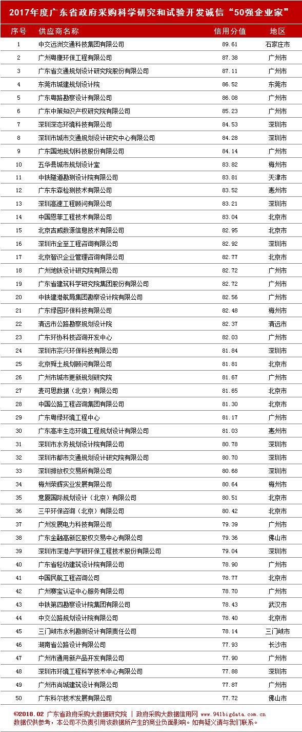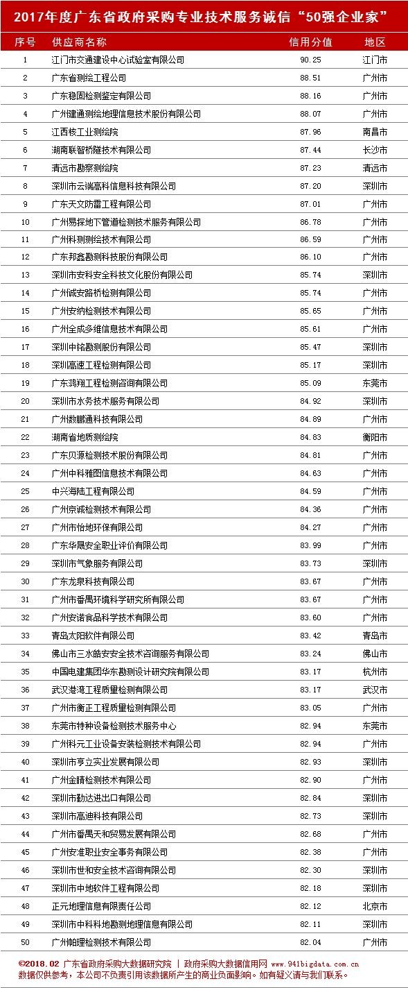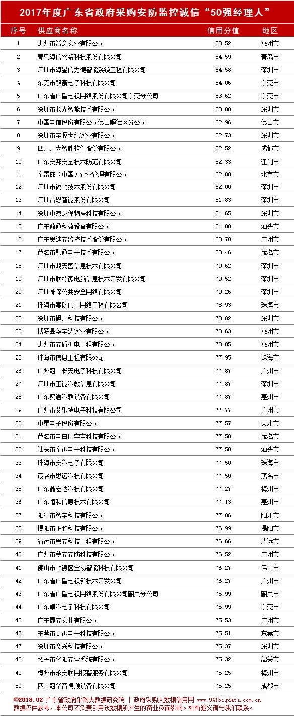 本次参评的政府采购供应商总数量达84418家,有效样本总数量84418家,代理机构总数达585家,有效样本数585家。数据来源于广东省内公开的各级政府采购相关信息,具体来源涵盖:广东省政府采购网的公开项目信息、政府各部门公布的采购信息、广东省政府采购各代理机构网站中公布的政府采购项目信息、中国政府采购网等。经广东省政府采购大数据研究院、政府采购大数据网综合评估,现正式对社会发布广东省政府采购代理机构诚信20强企业家榜单、代理机构诚信20强经理人榜单、代理机构竞争力20强榜单&供应商诚信100企业家榜单、供应商诚信100经理人榜单、供应商竞争力20强榜单。评估具体时段为:2017年1月1日至2017年12月31日。榜单公示期7天:2018年2月1日~7日。