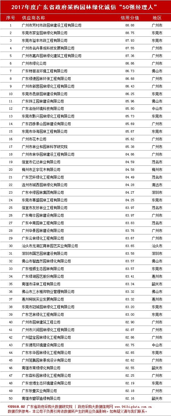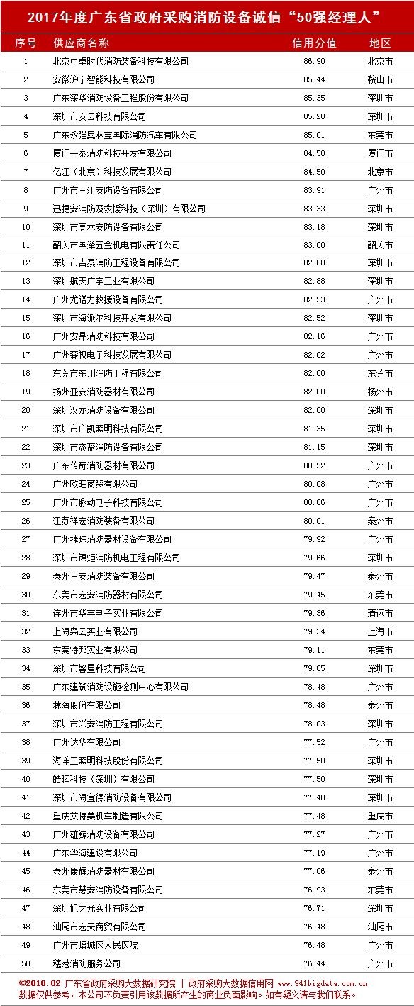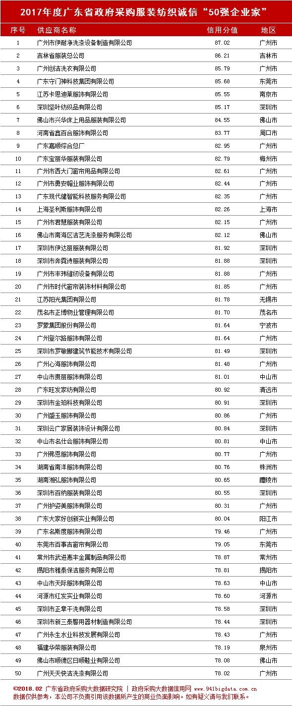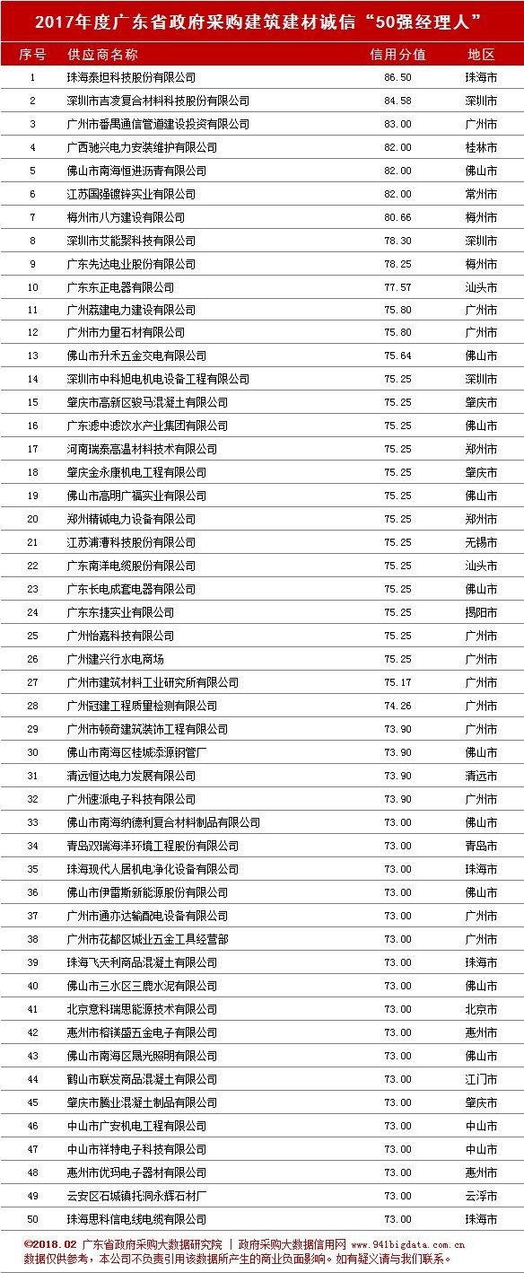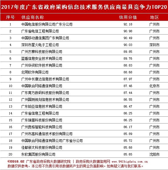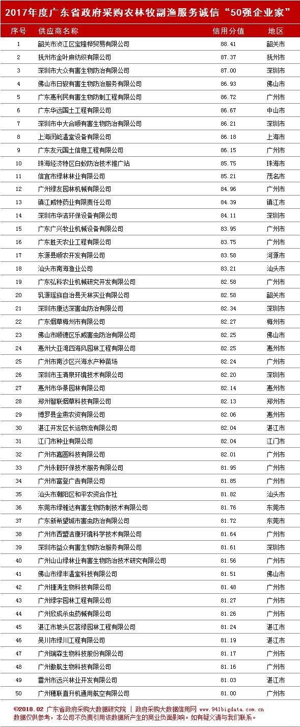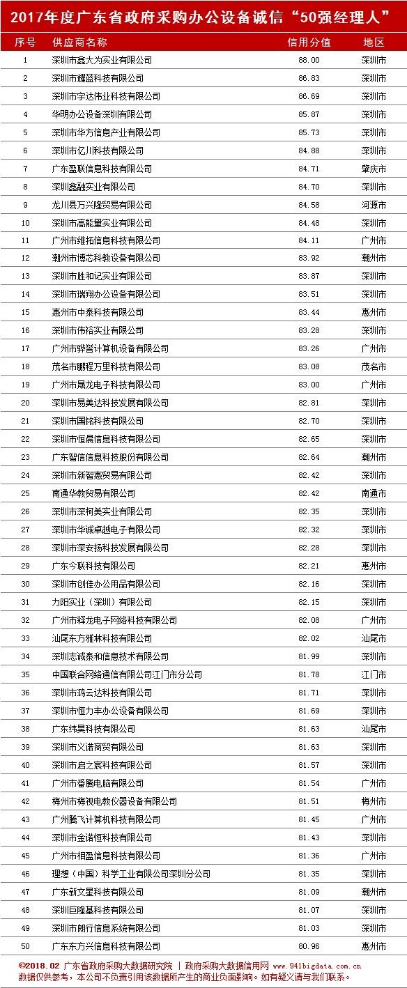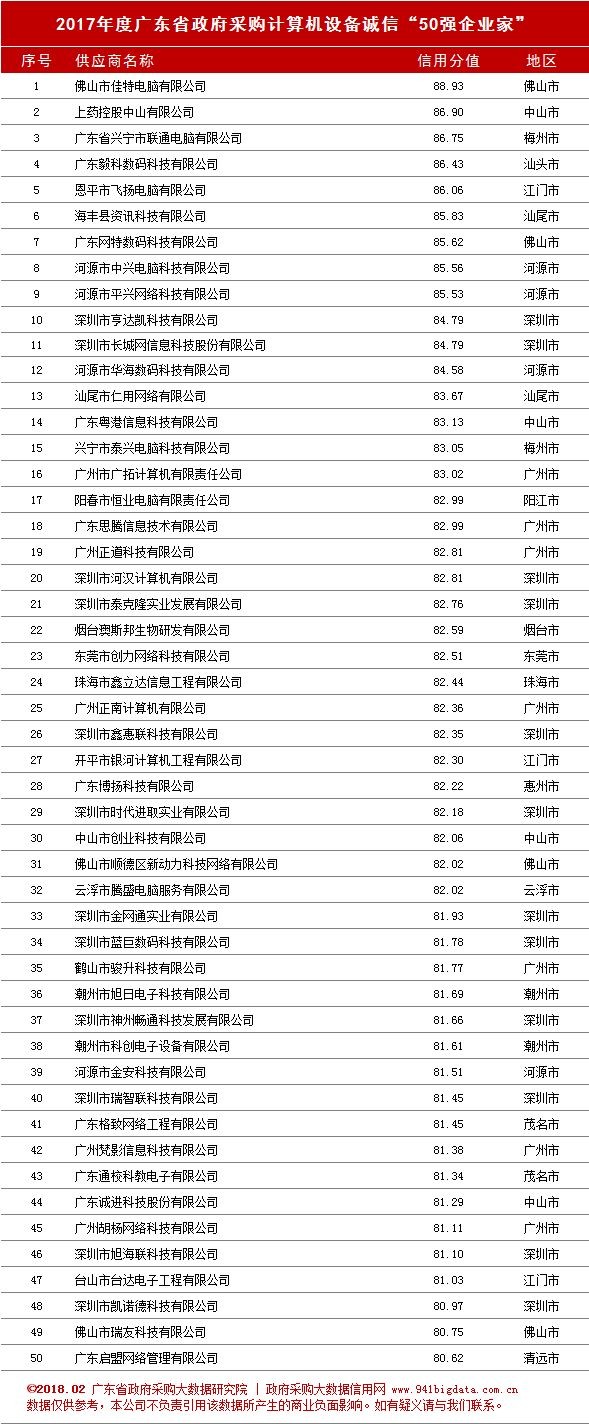 本次参评的政府采购供应商总数量达84418家,有效样本总数量84418家,代理机构总数达585家,有效样本数585家。数据来源于广东省内公开的各级政府采购相关信息,具体来源涵盖:广东省政府采购网的公开项目信息、政府各部门公布的采购信息、广东省政府采购各代理机构网站中公布的政府采购项目信息、中国政府采购网等。经广东省政府采购大数据研究院、政府采购大数据网综合评估,现正式对社会发布广东省政府采购代理机构诚信20强企业家榜单、代理机构诚信20强经理人榜单、代理机构竞争力20强榜单&供应商诚信100企业家榜单、供应商诚信100经理人榜单、供应商竞争力20强榜单。评估具体时段为:2017年1月1日至2017年12月31日。榜单公示期7天:2018年2月1日~7日。