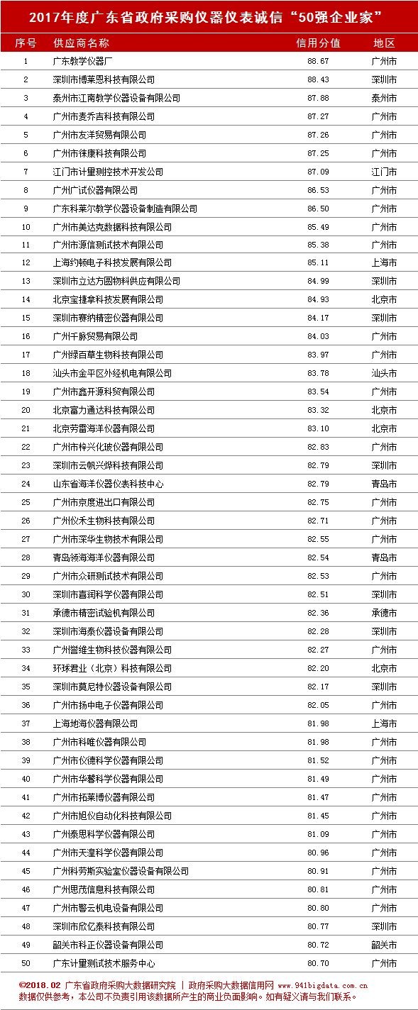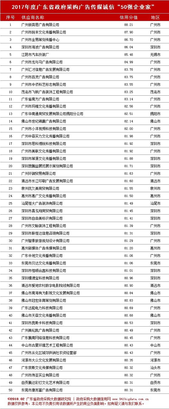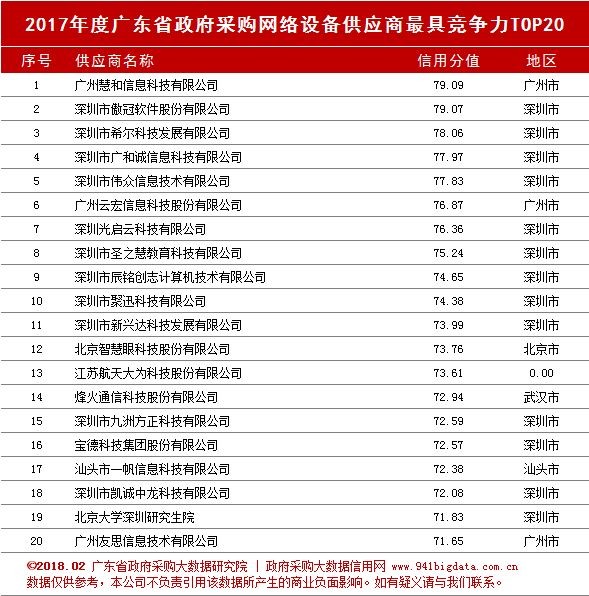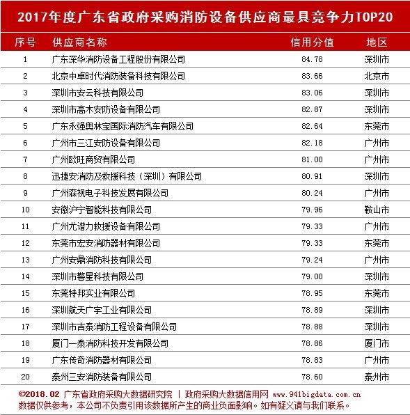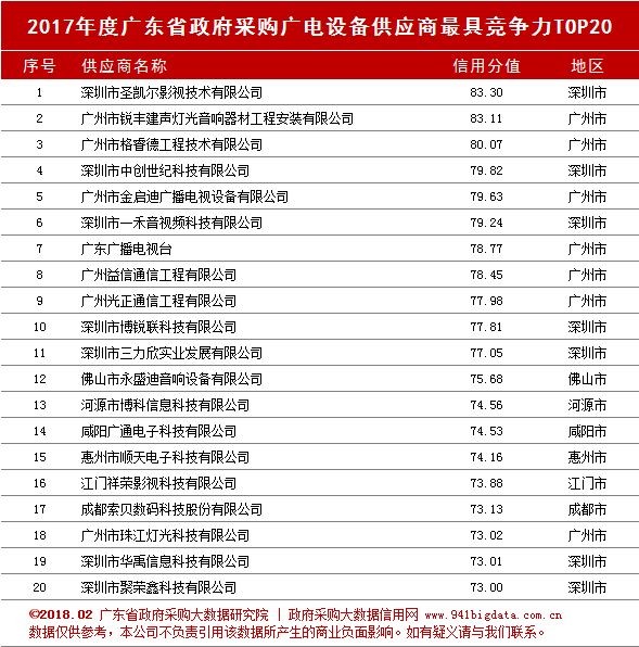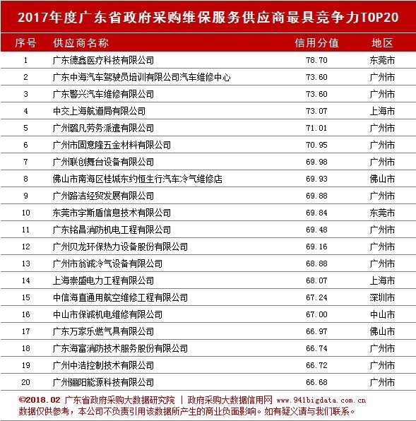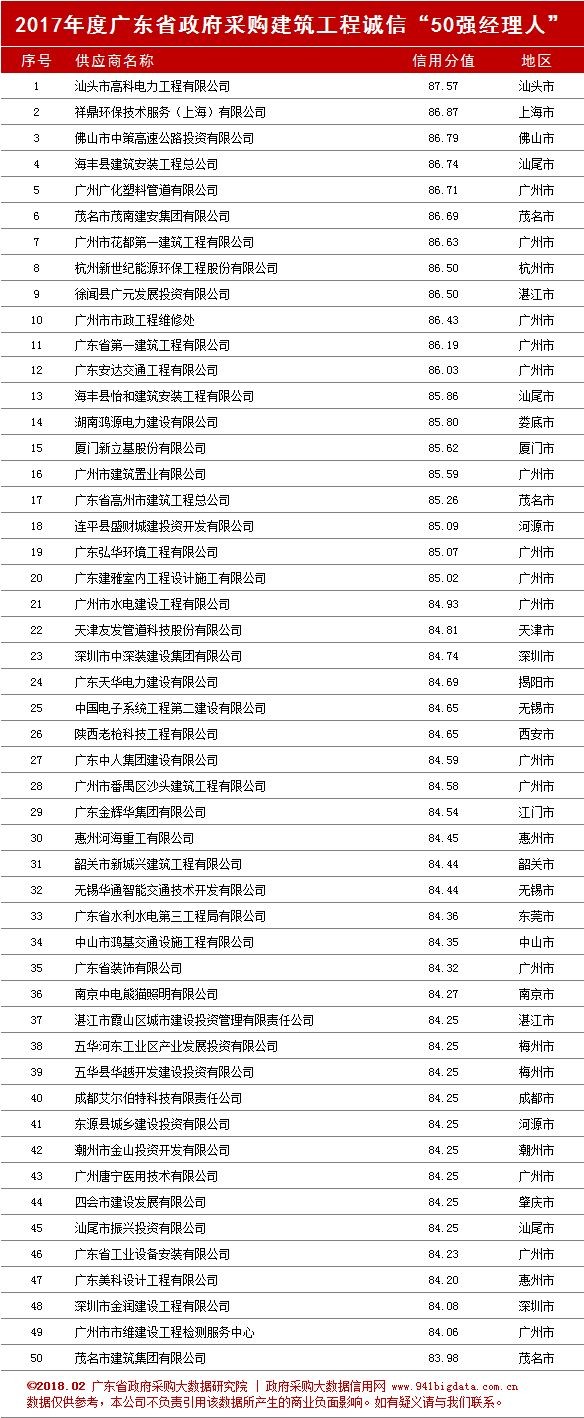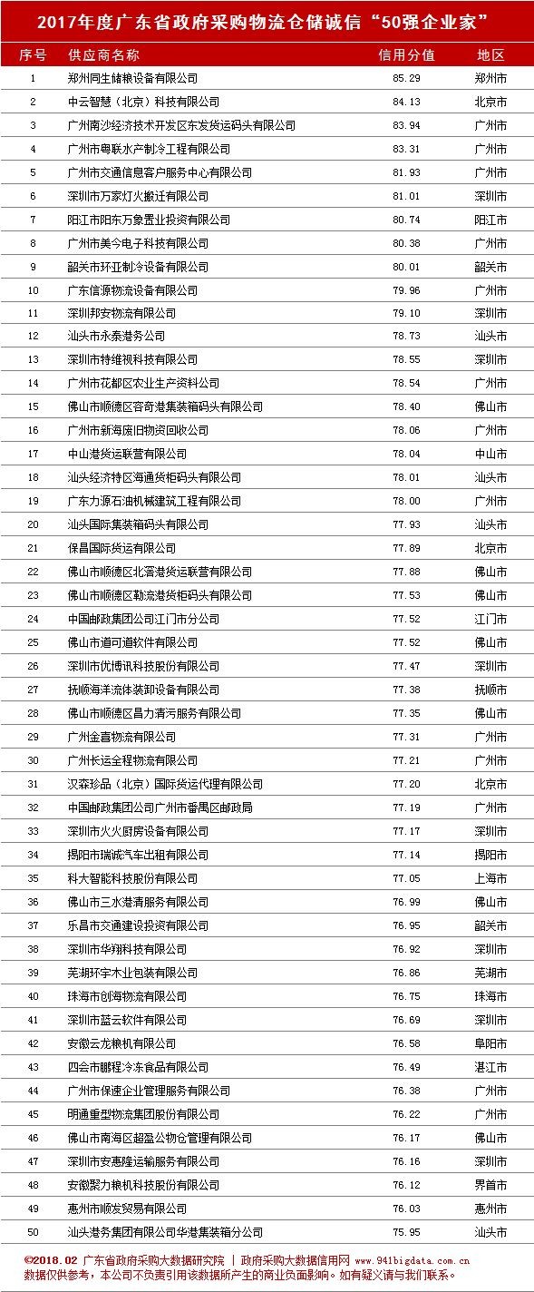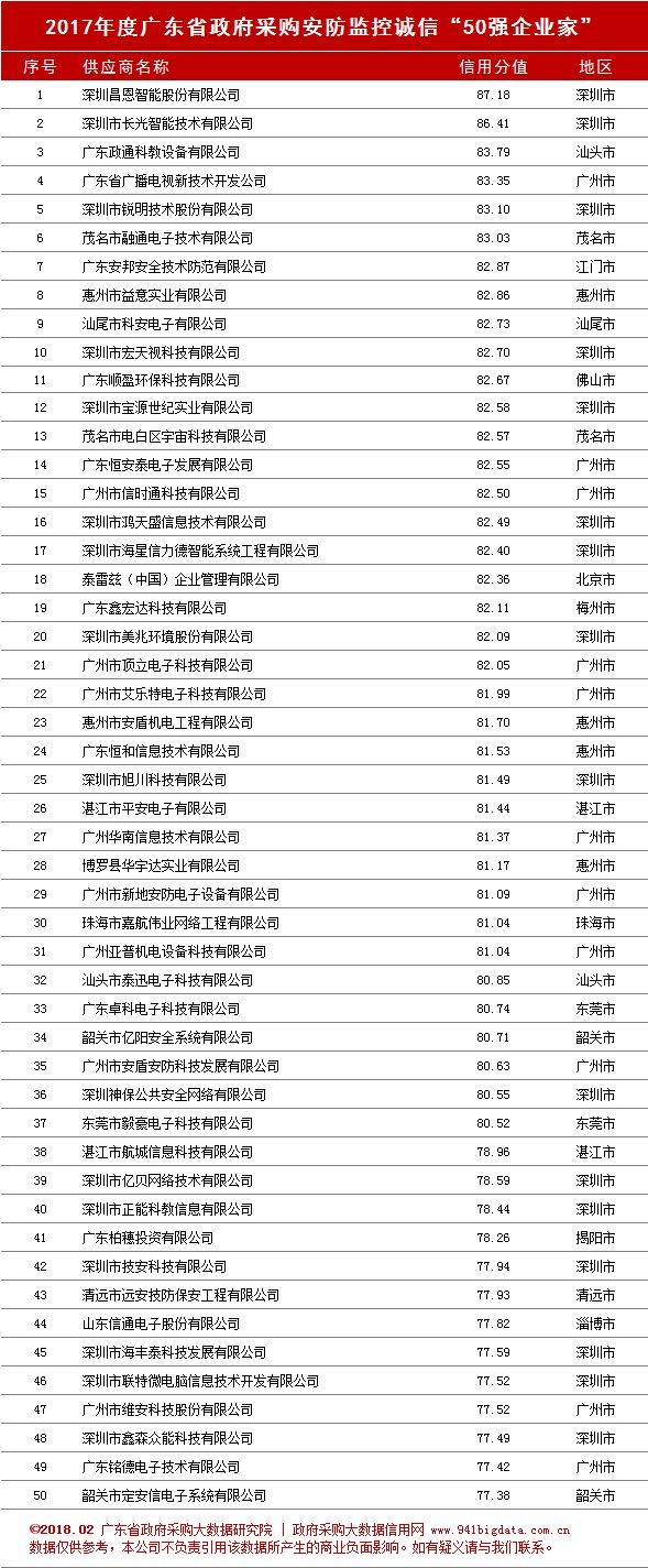 本次参评的政府采购供应商总数量达84418家,有效样本总数量84418家,代理机构总数达585家,有效样本数585家。数据来源于广东省内公开的各级政府采购相关信息,具体来源涵盖:广东省政府采购网的公开项目信息、政府各部门公布的采购信息、广东省政府采购各代理机构网站中公布的政府采购项目信息、中国政府采购网等。经广东省政府采购大数据研究院、政府采购大数据网综合评估,现正式对社会发布广东省政府采购代理机构诚信20强企业家榜单、代理机构诚信20强经理人榜单、代理机构竞争力20强榜单&供应商诚信100企业家榜单、供应商诚信100经理人榜单、供应商竞争力20强榜单。评估具体时段为:2017年1月1日至2017年12月31日。榜单公示期7天:2018年2月1日~7日。