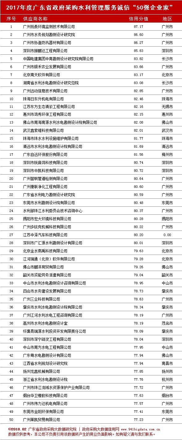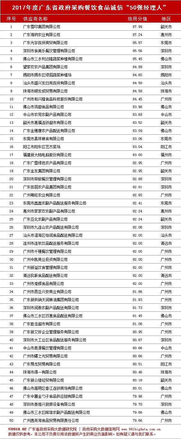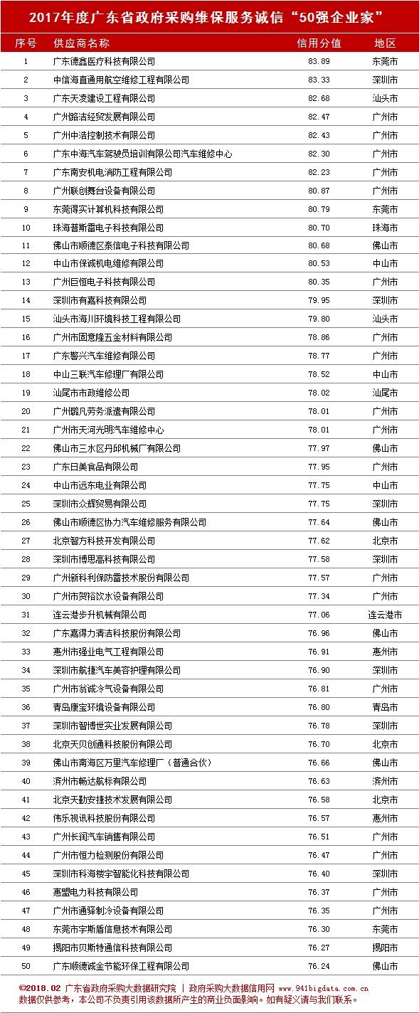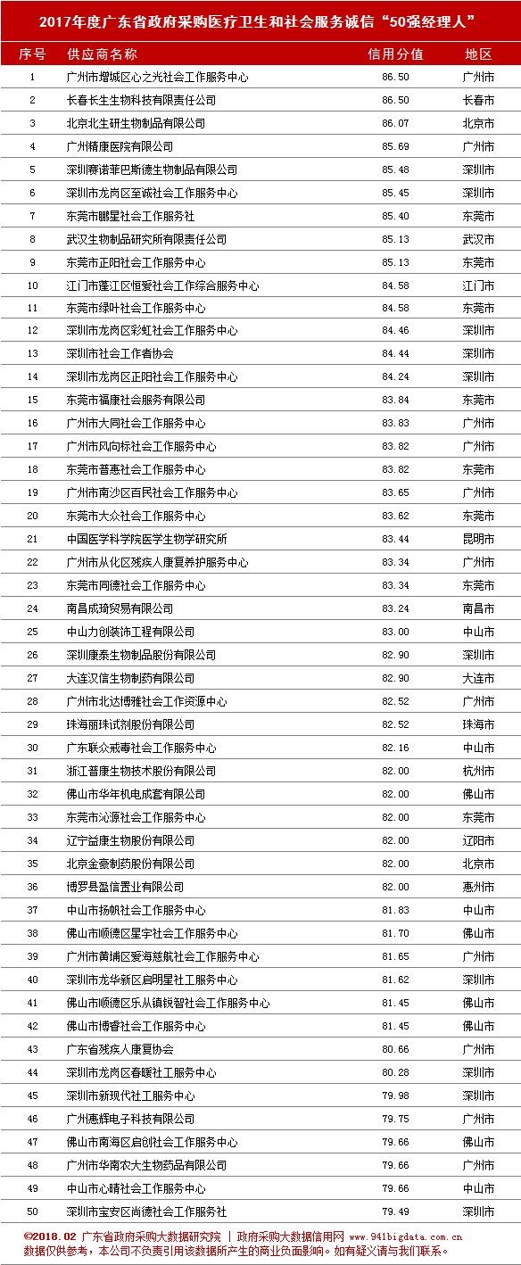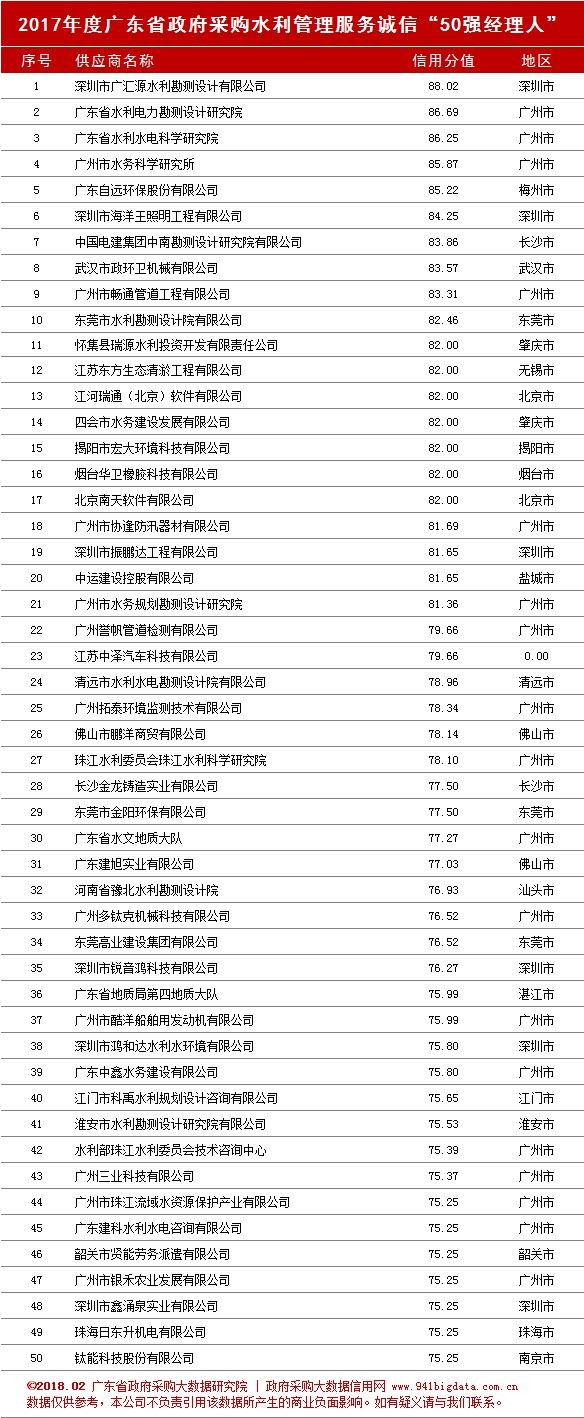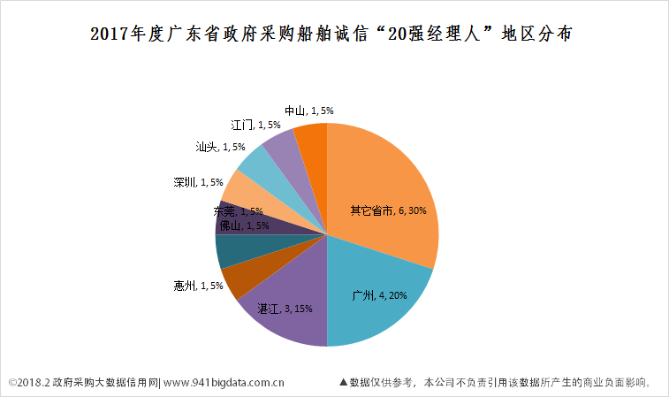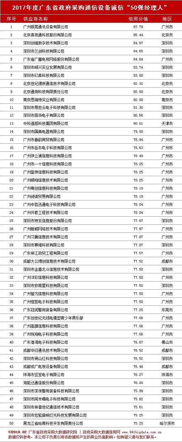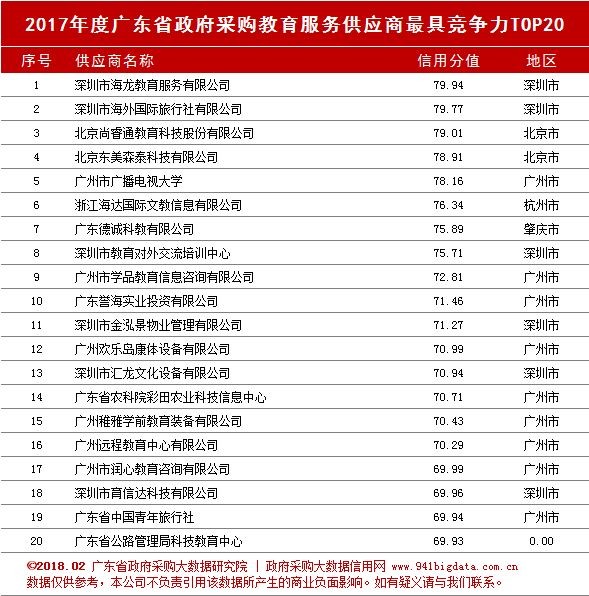 本次参评的政府采购供应商总数量达84418家,有效样本总数量84418家,代理机构总数达585家,有效样本数585家。数据来源于广东省内公开的各级政府采购相关信息,具体来源涵盖:广东省政府采购网的公开项目信息、政府各部门公布的采购信息、广东省政府采购各代理机构网站中公布的政府采购项目信息、中国政府采购网等。经广东省政府采购大数据研究院、政府采购大数据网综合评估,现正式对社会发布广东省政府采购代理机构诚信20强企业家榜单、代理机构诚信20强经理人榜单、代理机构竞争力20强榜单&供应商诚信100企业家榜单、供应商诚信100经理人榜单、供应商竞争力20强榜单。评估具体时段为:2017年1月1日至2017年12月31日。榜单公示期7天:2018年2月1日~7日。