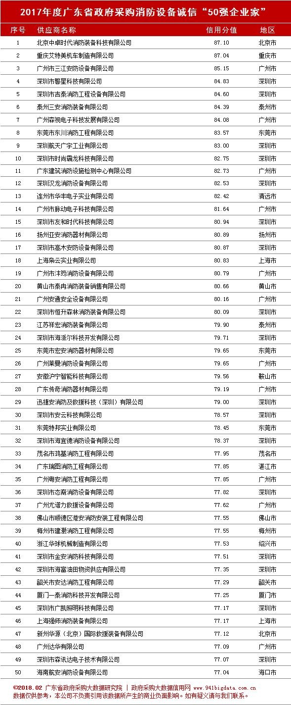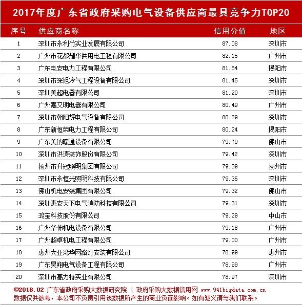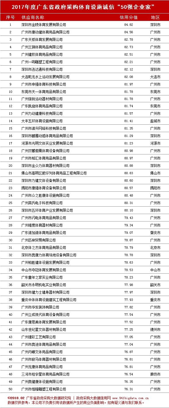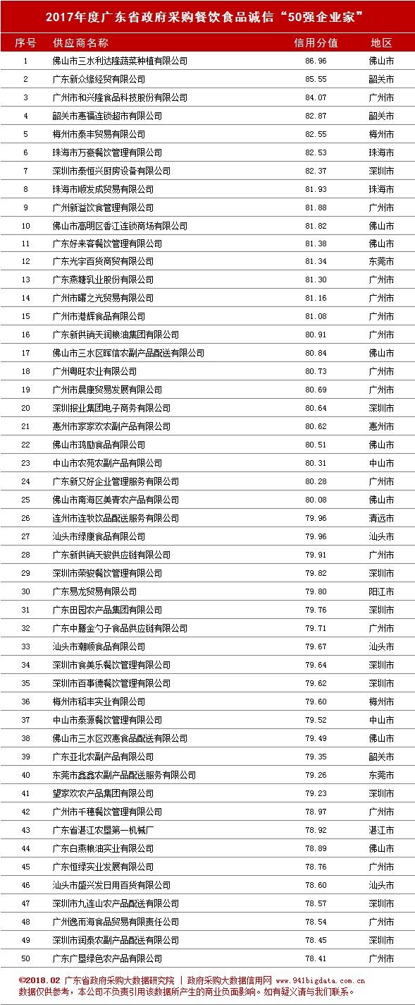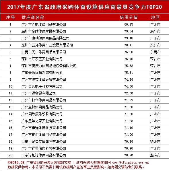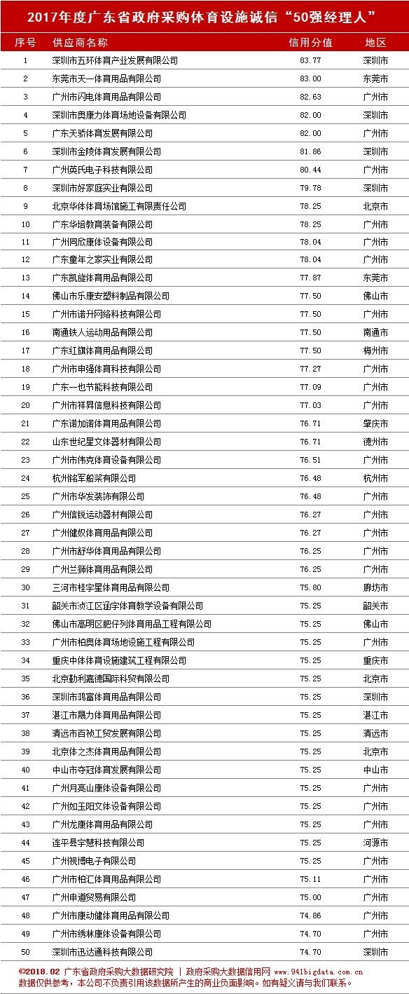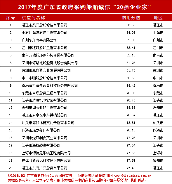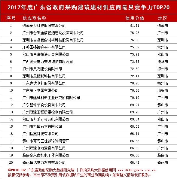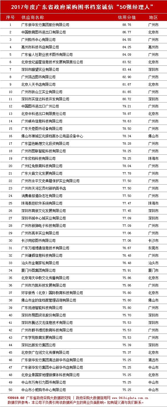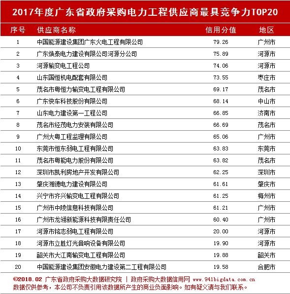 本次参评的政府采购供应商总数量达84418家,有效样本总数量84418家,代理机构总数达585家,有效样本数585家。数据来源于广东省内公开的各级政府采购相关信息,具体来源涵盖:广东省政府采购网的公开项目信息、政府各部门公布的采购信息、广东省政府采购各代理机构网站中公布的政府采购项目信息、中国政府采购网等。经广东省政府采购大数据研究院、政府采购大数据网综合评估,现正式对社会发布广东省政府采购代理机构诚信20强企业家榜单、代理机构诚信20强经理人榜单、代理机构竞争力20强榜单&供应商诚信100企业家榜单、供应商诚信100经理人榜单、供应商竞争力20强榜单。评估具体时段为:2017年1月1日至2017年12月31日。榜单公示期7天:2018年2月1日~7日。