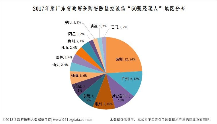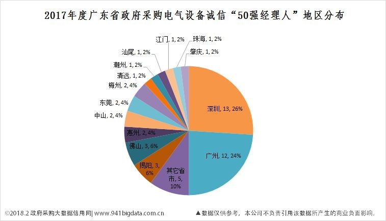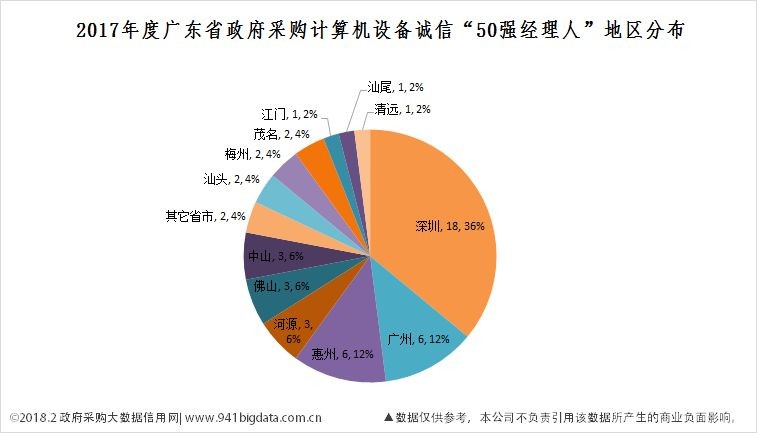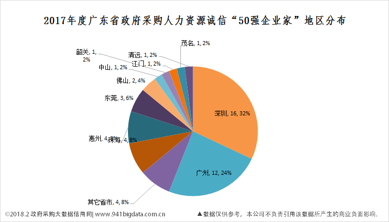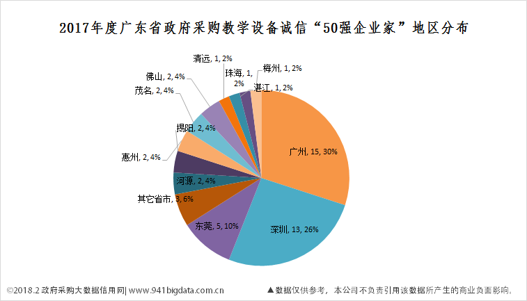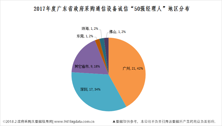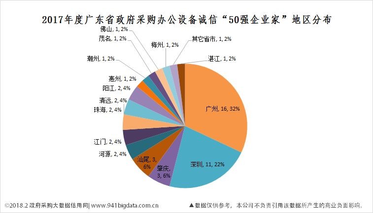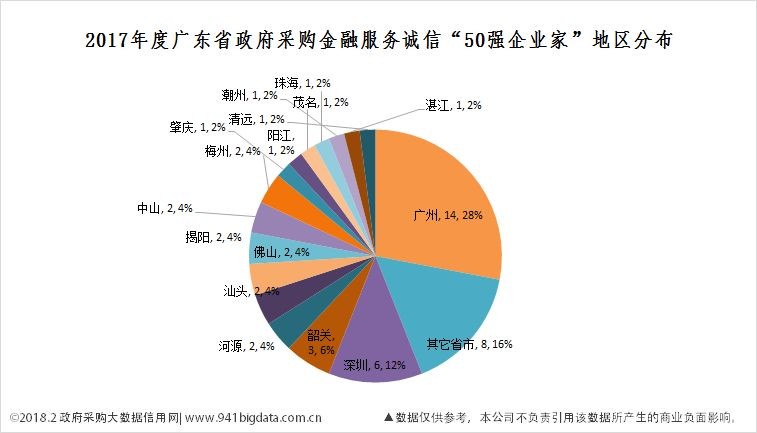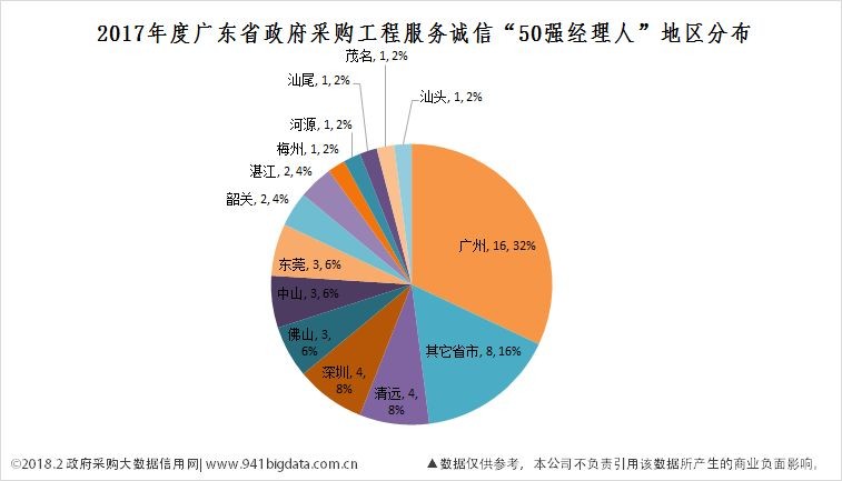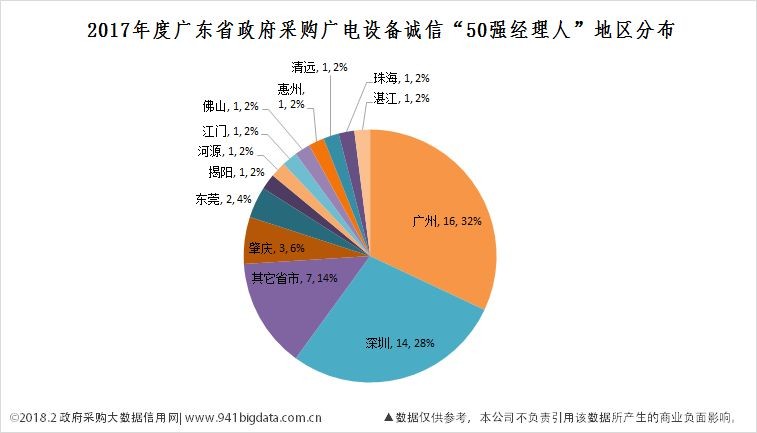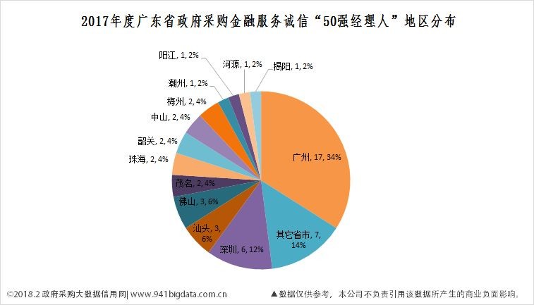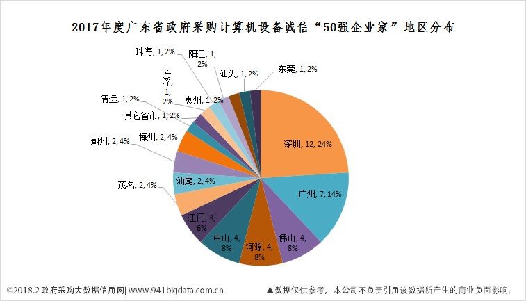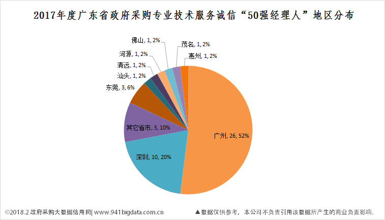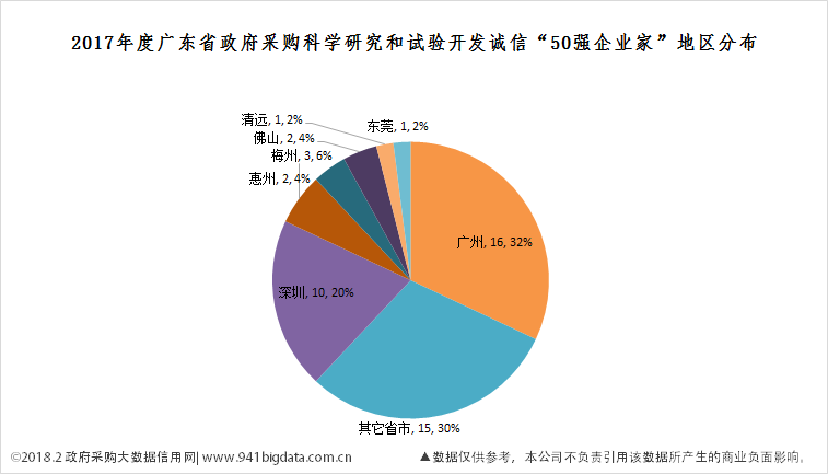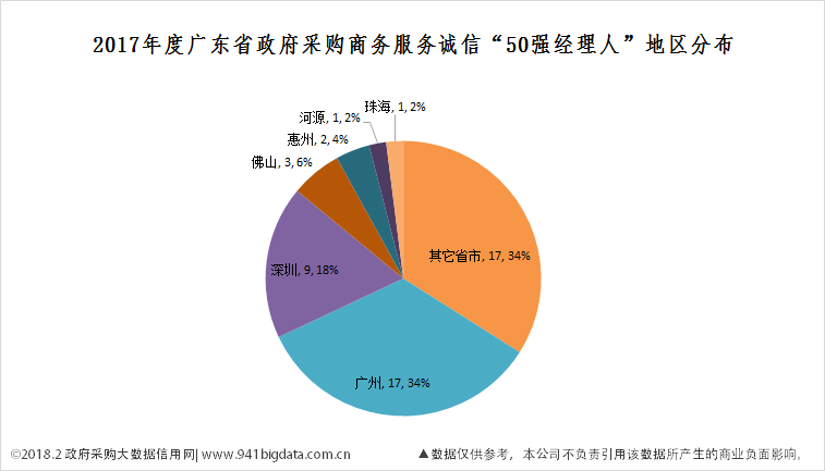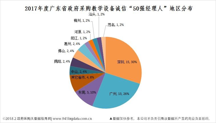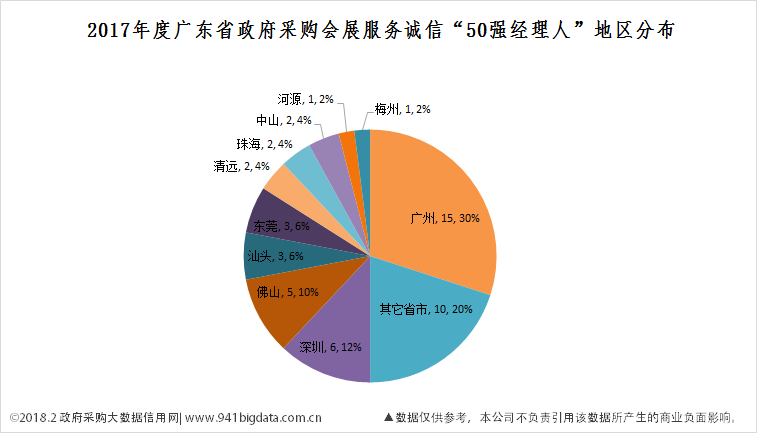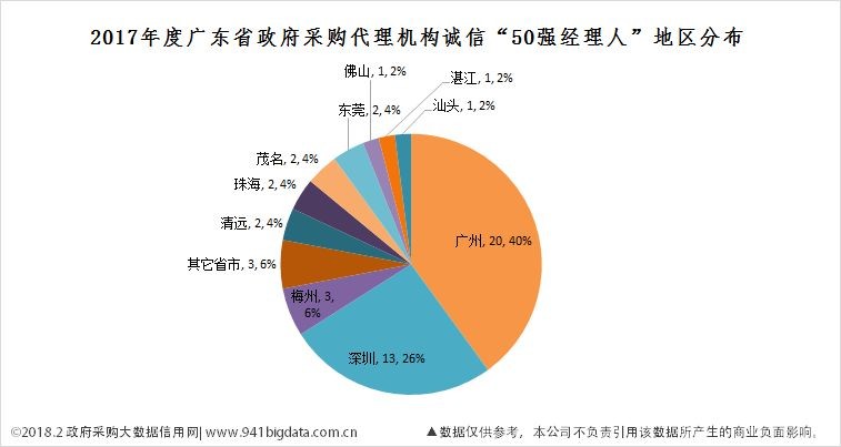 2017年度广东省政府采购信息技术服务诚信50强企业家主要集中分布在广州(30%)、深圳(24%)、东莞(6%)三个地区,合计占比60%,其中:佛山占比4%,珠海、汕头、梅州、肇庆及茂名各占比2%,其他省市占比26%,其余地区占比为0;
