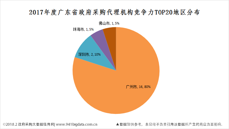 2017年度广东省政府采购最具竞争力代理机构20强主要集中分布在广州(80%)、深圳(10%)两个地区,合计占比高达90%,其中:珠海、佛山分别占比5%,其余地区占比为0;