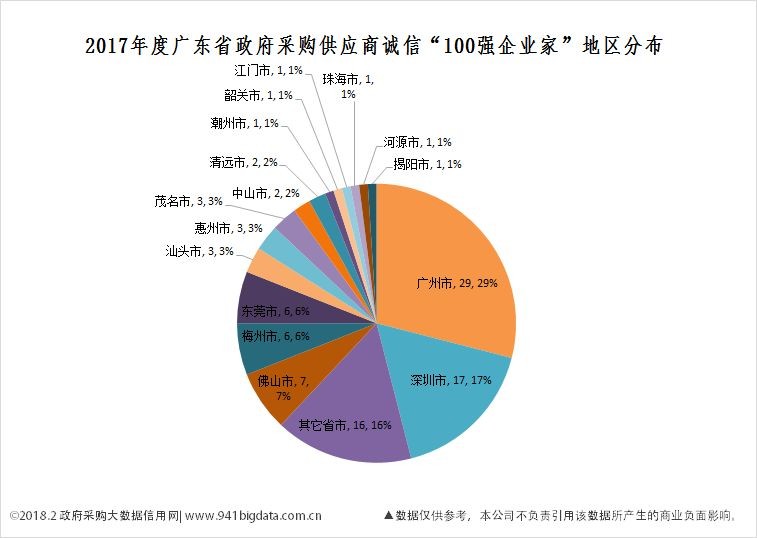 2017年度广东省政府采购100强诚信企业家主要集中分布在广州(29%)、深圳(17%)、佛山(7%)三个地区,合计占比53%,其中:梅州、东莞各占比6%,汕头、惠州及茂名各占比3%,中山、清远各占比2%,潮州、韶关、江门、珠海、河源及揭阳各占比1%,其他省市占比165,其余地区占比为0;