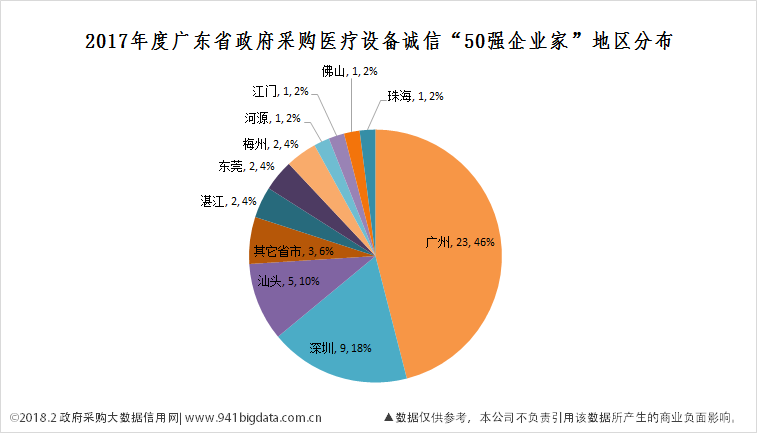 2017年度广东省政府采购医疗设备50强诚信企业家主要集中分布在广州(46%)、深圳(18%)、汕头(10%)三个地区,合计占比74%,其中:湛江、梅州、东莞各占比4%,河源、江门、佛山、珠海各占比2%,其他省市占比6%,其余地区占比为0;