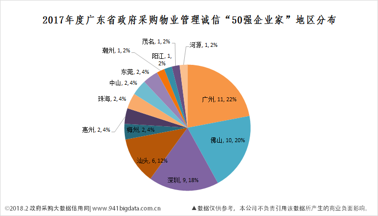 2017年度广东省政府采购物业管理50强诚信企业家主要集中分布在广州(22%)、佛山(20%)、深圳(18%)、汕头(12%)四个地区,合计占比72%,其中:梅州、惠州、珠海、中山及东莞各占比4%,潮州、阳江、茂名及河源各占比2%,其余地区占比为0;