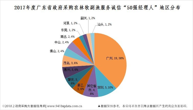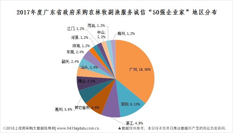 2017年度广东省政府采购餐饮食品50强诚信企业家主要集中分布在广州(30%)、深圳(18%)、佛山(16%)三个地区,合计占比64%,其中:韶关、汕头各占比6%,东莞、珠海、中山及梅州各占比4%,阳江、惠州、清远、湛江各占比2%,其余地区占比为0;