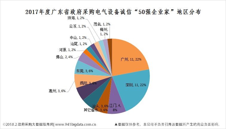 2017年度广东省政府采购电气设备50强诚信企业家主要集中分布在广州(22%)、深圳(22%)、江门(8%)三个地区,合计占比52%,其中:汕头、惠州、揭阳及东莞各占比6%,佛山占比4%,河源、汕尾、中山、云浮、珠海、茂名及梅州分别占比2%,其他省市占比6%,其余地区占比为0;