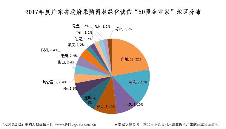 2017年度广东省政府采购园林绿化50强诚信企业家主要集中分布在广州(22%)、东莞(16%)、茂名(10%)、韶关(10%)四个地区,合计占比58%,其中:深圳占比8%,汕头占比6%,佛山、惠州、珠海各自占比4%,肇庆、汕尾、中山、清远、揭阳及梅州各占比2%,其他省市占比4%,其余地区占比为0;