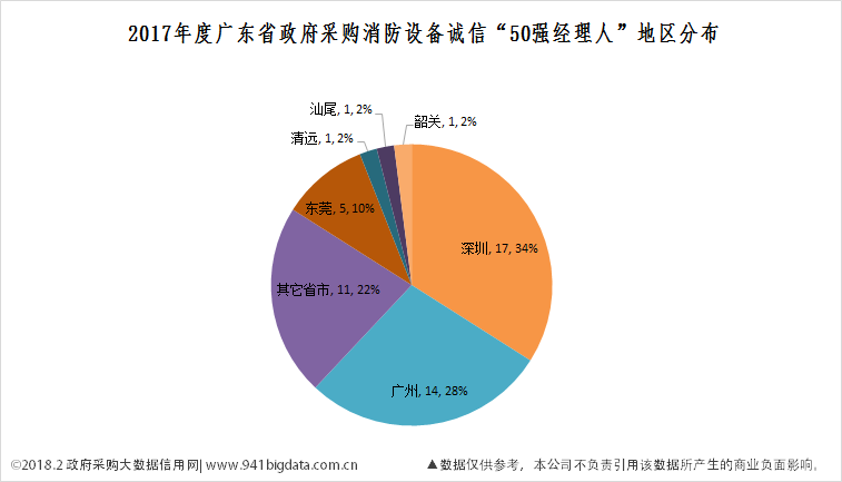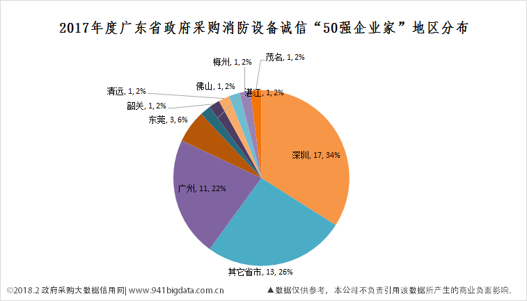 2017年度广东省政府采购消防设备50强诚信企业家主要集中分布在深圳(34%)、广州(22%)两个地区,合计占比56%,其中:东莞占比6%,韶关、清远、佛山、湛江、梅州及茂名各占比2%,其他省市占比26%,其余地区占比为0;