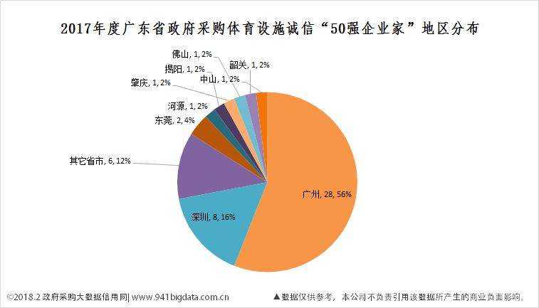 2017年度广东省政府采购体育设施50强诚信企业家主要集中分布在广州(56%)、深圳(16%)两个地区,合计占比72%,其中:东莞占比4%,河源、肇庆、揭阳、佛山、中山及韶关各占比2%,其他省市占比12%,其余地区占比为0;