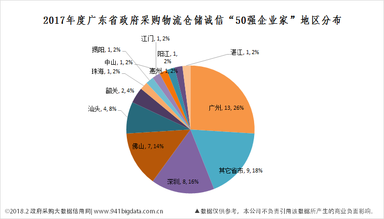 2017年度广东省政府采购物流仓储50强诚信企业家主要集中分布在广州(26%)、深圳(16%)、佛山(14%)三个地区,合计占比56%,其中:汕头占比8%,韶关占比4%,珠海、中山、揭阳、惠州、阳江、江门及湛江各占比2%,其他省市占比18%,其余地区占比为0;
