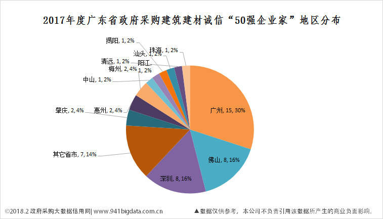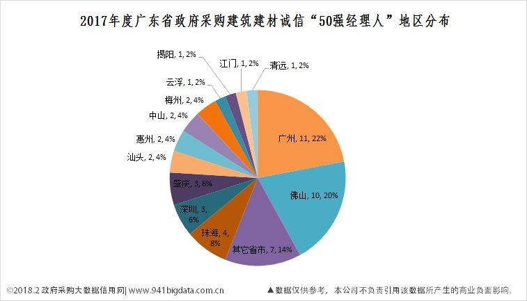 2017年度广东省政府采购建筑建材50强诚信企业家主要集中分布在广州(30%)、佛山(16%)及深圳(16%)三个地区,合计占比62%,其中:肇庆、惠州各占比4%,中山、梅州、阳江、清远、汕头、揭阳及珠海各占比2%,其他省市占比14%,其余地区占比为0;