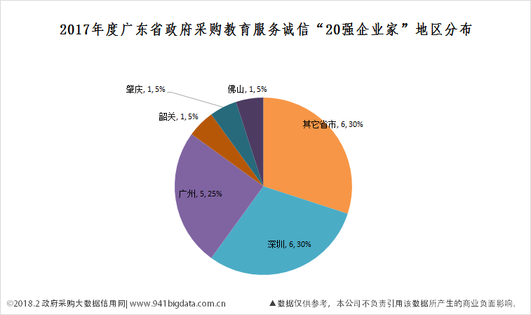 2017年度广东省政府采购教育服务20强诚信企业家主要集中分布在深圳(30%)、广州(25%)两个地区,合计占比55%,其中:韶关、肇庆及佛山各占比5%,其他省市占比30%,其余地区占比为0;