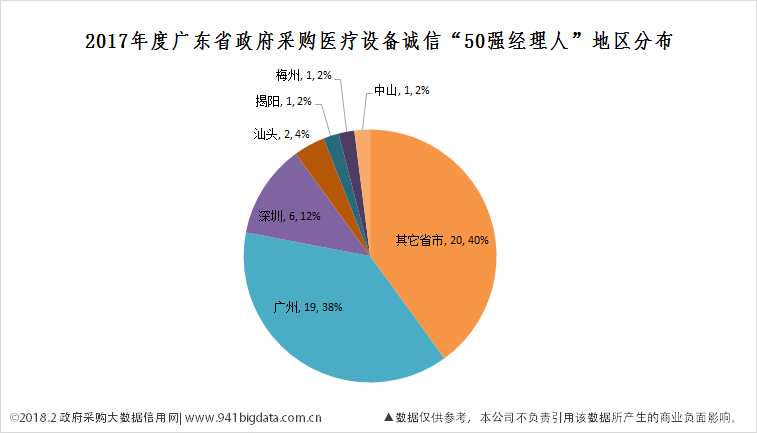 2017年度广东省政府采购租赁服务50强诚信企业家主要集中分布在深圳(38%)、广州(36%)、珠海(8%)、佛山(8%)四个地区,合计占比90%,其中:揭阳占比4%,中山及汕头各占比2%,其他省市占比2%,其余地区占比为0;