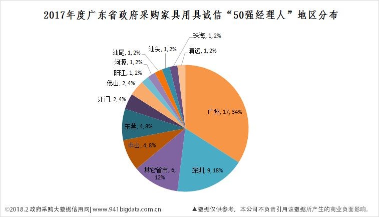 2017年度广东省政府采购家具用具50强诚信企业家主要集中分布在广州(42%)、深圳(24%)、佛山(8%)、江门(6%)及东莞(6%)五个地区,合计占比86%,其中:中山、揭阳各占比4%,清远、汕头及河源各占比2%,其余地区占比为0;