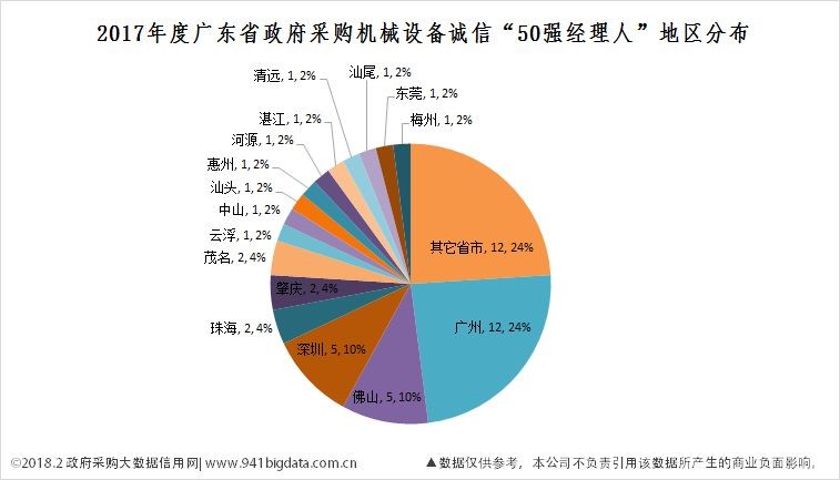 2017年度广东省政府采购机械设备50强诚信企业家主要集中分布在广州(26%)、深圳(14%)、佛山(8%)三个地区,合计占比48%,其中:韶关、茂名及潮州各占比6%,云浮、惠州各占比4%,江门、肇庆、梅州、揭阳、阳江、珠海、汕头、湛江各占比2%,其他省市占比10%,其余地区占比为0;
