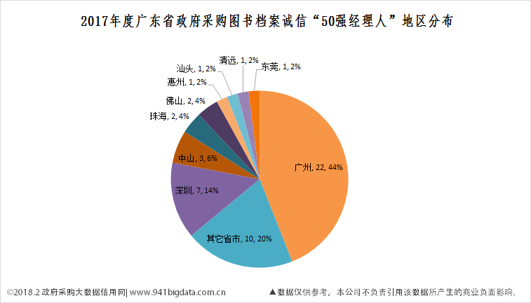 2017年度广东省政府采购图书档案50强诚信企业家主要集中分布在广州(42%)、深圳(14%)两个地区,合计占比56%,其中:江门、中山各占比4%,佛山、汕头、惠州、清远、云浮及东莞各占比2%,其他省市占比24%,其余地区占比为0;