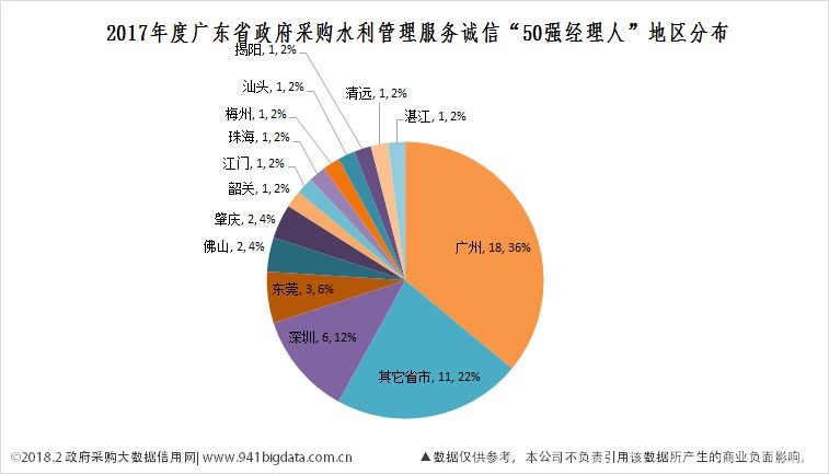 2017年度广东省政府采购水利管理服务50强诚信企业家主要集中分布在广州(30%)、深圳(10%)两个地区,合计占比40%,其中:肇庆、佛山各占比6%,珠海、中山及东莞各占比4%,惠州、清远、揭阳、梅州、韶关及茂名各占比2%,其他省市占比24%,其余地区占比为0;