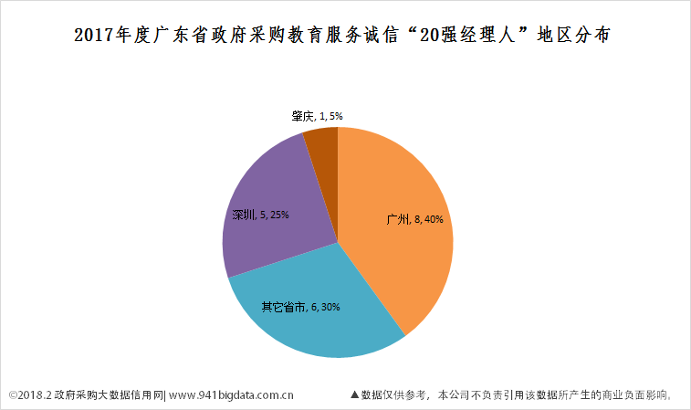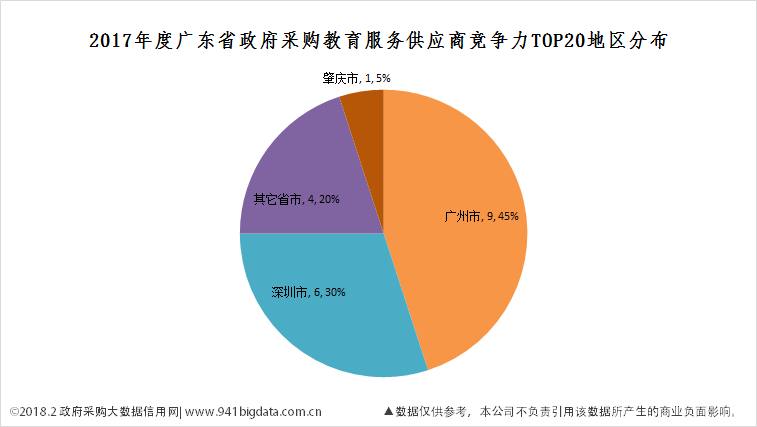 2017年度广东省政府采购最具竞争力教育服务20强主要集中分布在广州(45%)、深圳(30%)、肇庆(5%)三个地区,合计占比80%,其中:其他省市占比20%,其余地区占比为0;