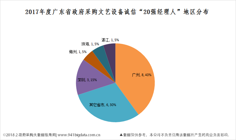 2017年度广东省政府采购最具竞争力文艺设备20强主要集中分布在广州(35%)、深圳(20%)两个地区,合计占比高达55%,其中:珠海、梅州及湛江分别占比5%,其他省市占比30%,其余地区占比为0;