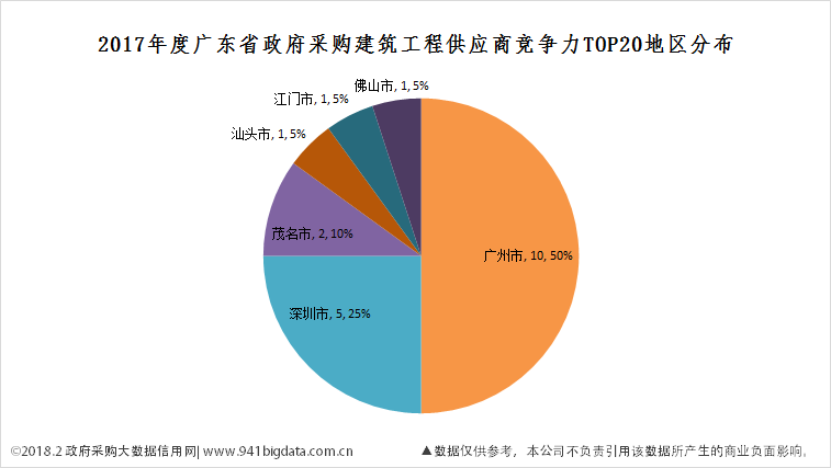 2017年度广东省政府采购最具竞争力建筑工程20强主要集中分布在广州(50%)、深圳(25%)、茂名(10%)三个地区,合计占比85%,其中:汕头、佛山、江门三个地区分别占比2%,其余地区占比为0;