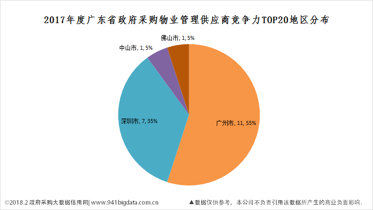 2017年度广东省政府采购最具竞争力物业管理20强主要集中分布在广州(55%)、深圳(35%)两个地区,合计占比90%,其中:中山、佛山分别占比5%,其余地区占比为0;