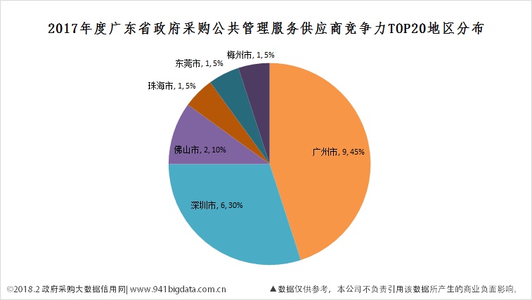 2017年度广东省政府采购最具竞争力公共管理服务20强主要集中分布在广州(45%)、深圳(20%)及佛山(10%)三个地区,合计占比75%,东莞、中山分别占比5%,其中:其他省市占比15%,其余地区占比为0;