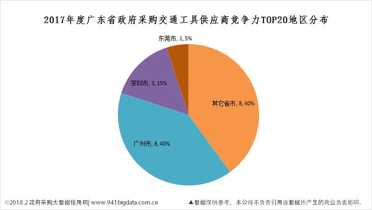 2017年度广东省政府采购最具竞争力交通工具20强主要集中分布在广州(40%)、深圳(15%)及江门(5%)三个地区,合计占比60%,其中:其他省市占比40%,其余地区占比为0;