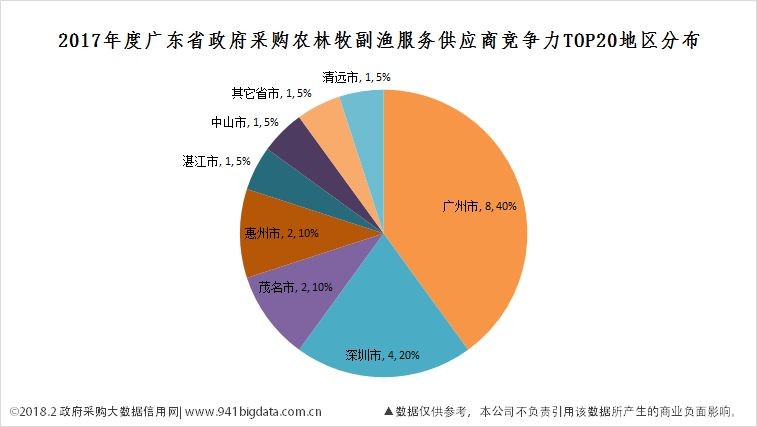2017年度广东省政府采购最具竞争力农林牧副渔20强主要集中分布在广州(40%)、深圳(20%)、茂名(10%)及惠州(10%)四个地区,合计占比高达80%,其中:清远、湛江及中山分别占比5%,其余地区占比为0;