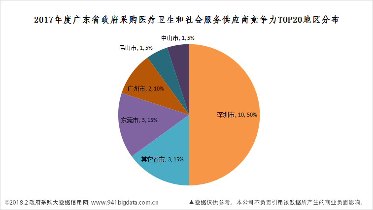2017年度广东省政府采购最具竞争力医疗卫生和社会服务20强主要集中分布在深圳(50%)、东莞(15%)及广州(10%)三个地区,合计占比75%,其中:佛山、中山分别占比2%,其他省市占比15%,其余地区占比均为0;