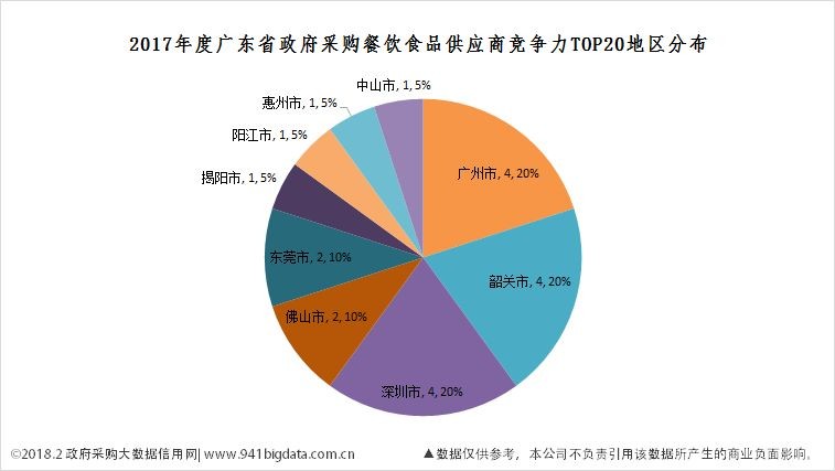 2017年度广东省政府采购最具竞争力餐饮食品20强主要集中分布在广州(20%)、韶关(20%)、深圳(20%)、佛山(10%)及东莞(10%)五个地区,合计占比80%,其中:阳江、揭阳、中山及惠州分别占比5%,其余地区占比均为0;