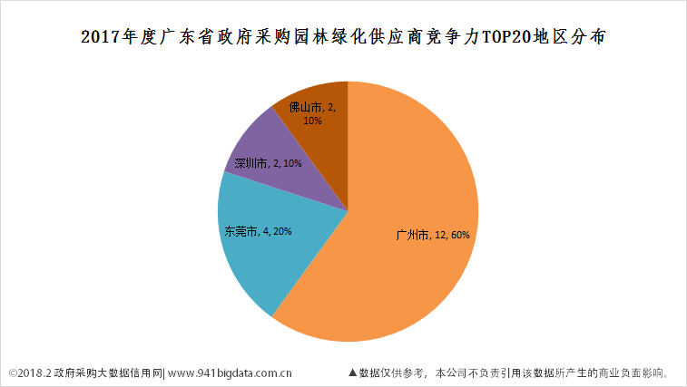 2017年度广东省政府采购最具竞争力园林绿化20强主要集中分布在广州(60%)、东莞(20%)、两个地区,合计占比高达80%,其中:深圳、佛山两市分别占比10%,其余地区占比均为0;