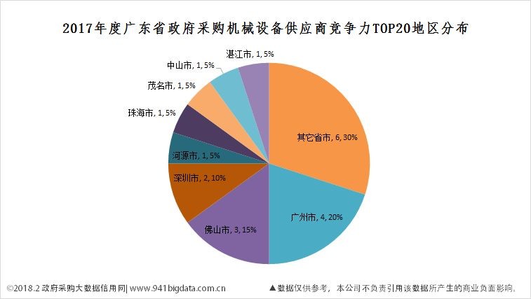 2017年度广东省政府采购最具竞争力机械设备20强主要集中分布在广州(20%)、佛山(15%)及深圳(10%)合计占比45%,其中:湛江、中山、茂名、珠海及河源分别占比5%,其他省市占比30%,其余地区占比为0;
