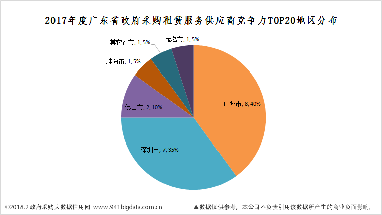 2017年度广东省政府采购最具竞争力租赁服务20强主要集中分布在广州(40%)、深圳(35%)及佛山(10%)三个地区,合计占比高达85%,其中:珠海及茂名分别占比5%,其他省市占比5%,其余地区占比为0;