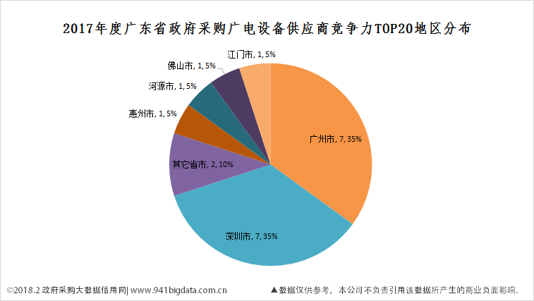 2017年度广东省政府采购最具竞争力广电设备20强主要集中分布在广州(35%)、深圳(35%)两个地区,合计占比70%,其中:惠州、河源、佛山及江门分别占比5%,其他省市占比10%,其余地区占比为0;