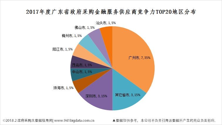2017年度广东省政府采购最具竞争力金融服务20强主要集中分布在广州(35%)、深圳(15%)两个地区,合计占比高达50%,其中:汕头、佛山、梅州、阳江、茂名、中山及珠海七个地区分别占比5%,其他省市占比15%,其余地区占比为0;