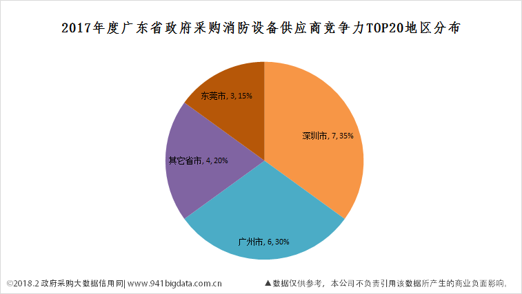2017年度广东省政府采购最具竞争力消防设备20强主要集中分布在深圳(35%)、广州(30%)及东莞(15%)三个地区,合计占比高达80%,其中:其他省市占比20%,其余地区占比为0;