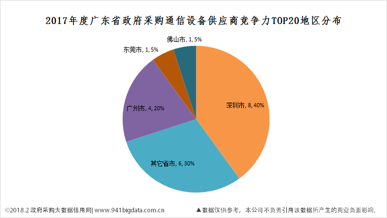 2017年度广东省政府采购最具竞争力通信设备20强主要集中分布在深圳(40%)、广州(20%)、东莞(5%)及佛山(5%)四个地区,合计占比高达70%,其中:其他省市占比30%,其余地区占比为0;