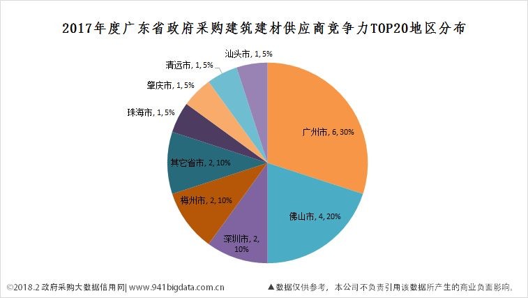 2017年度广东省政府采购最具竞争力建筑建材20强主要集中分布在广州(30%)、佛山(20%)、深圳(10%)、梅州(10%)四个地区,合计占比高达70%,其中:汕头、清远、肇庆及珠海占比5%,其他省市占比10%,其余地区占比均为0;