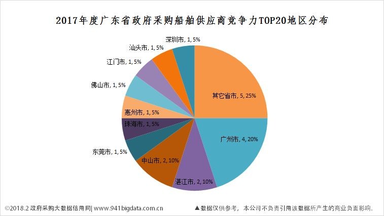 2017年度广东省政府采购最具竞争力船舶20强主要集中分布在广州(20%)、湛江(10%)、中山(10%)三个地区,合计占比40%,其中:深圳、汕头、江门、佛山、惠州、珠海及东莞七个地区分别占比5%,其他省市占比25%,其余地区占比为0;
