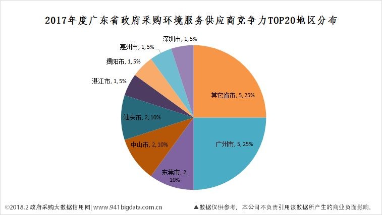 2017年度广东省政府采购最具竞争力环境服务20强主要集中分布在广州(25%)、东莞(10%)、汕头(10%)及中山(10%)四个地区,合计占比55%,其中:深圳、惠州、揭阳及湛江分别占比5%,其他省市占比25%,其余地区占比为0;