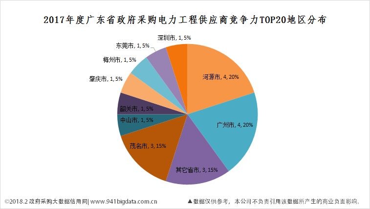 2017年度广东省政府采购最具竞争力电力工程20强主要集中分布在河源(20%)、广州(20%)及茂名(15%)三个地区,合计占比高达55%,其中:深圳、东莞、梅州、肇庆、韶关及中山六个地区分别占比5%,其他省市占比15%,其余地区占比为0;