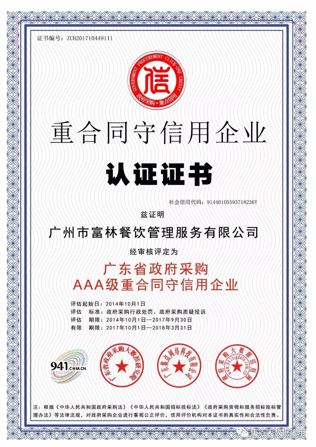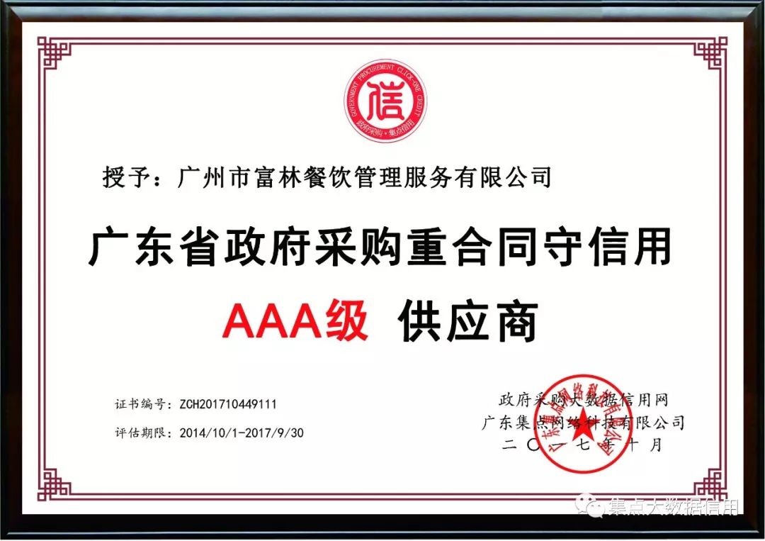 富林餐饮政府采购诚信守法信用AAA级荣誉牌匾